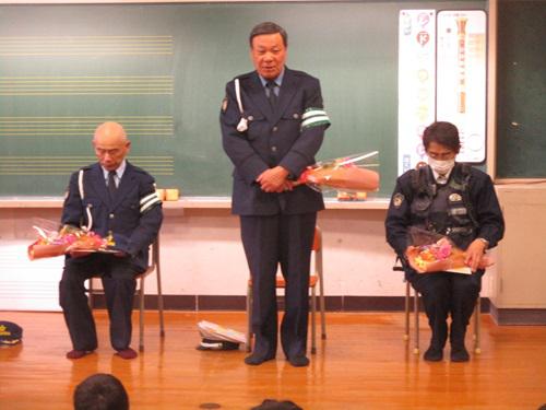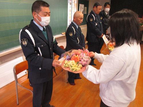 会では、児童代表が日頃の感謝を込めてお礼のメッセージを伝え、花束を贈呈しました。その後、お一人お一人からご挨拶をいただき、交通安全で気をつけてほしいことやこどもたちの笑顔が励みになっていることなど、温かい励ましの言葉をいただきました。