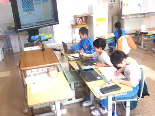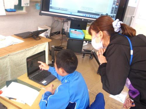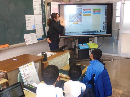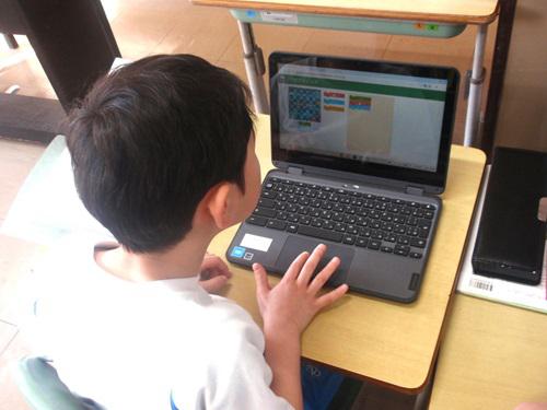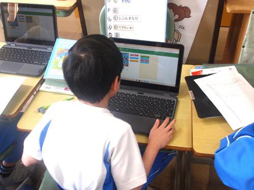 3月12日、2年生は算数でプログラミング学習に取り組みました。タブレットを使い、教科書の「わくわく プログラミング」に挑戦です。