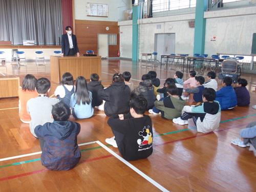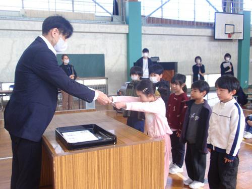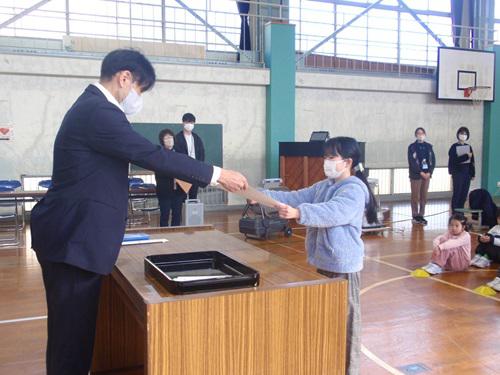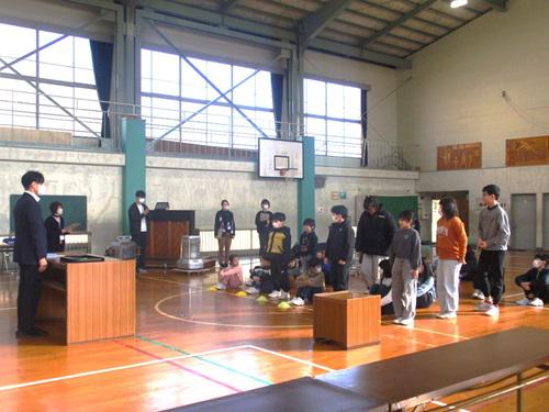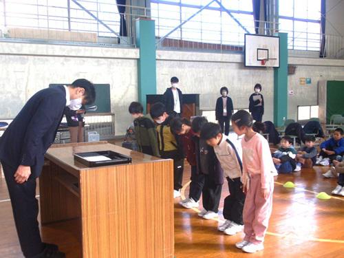 「書き初め展」と「学びの貯金箱」の表彰の後、明日の卒業式が一人一人にとって最高の式となるよう、心を一つにして臨もうと呼びかけました。