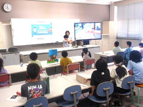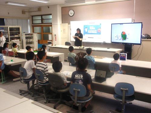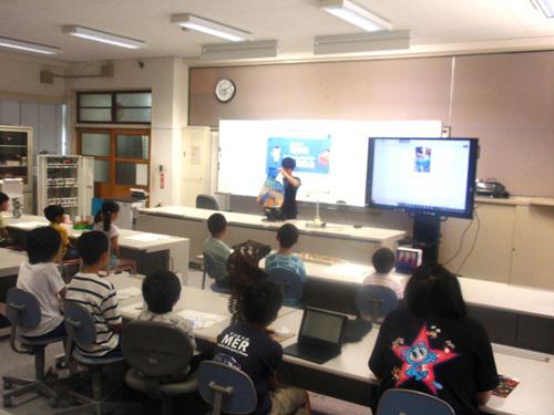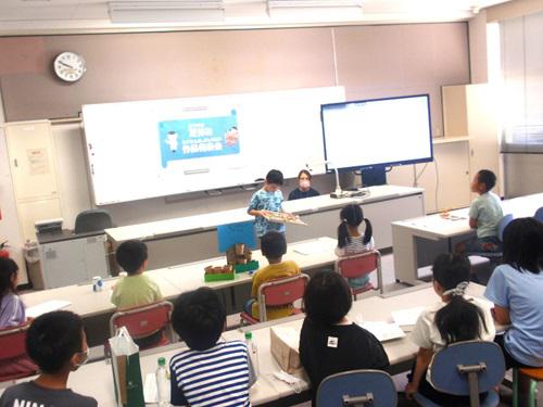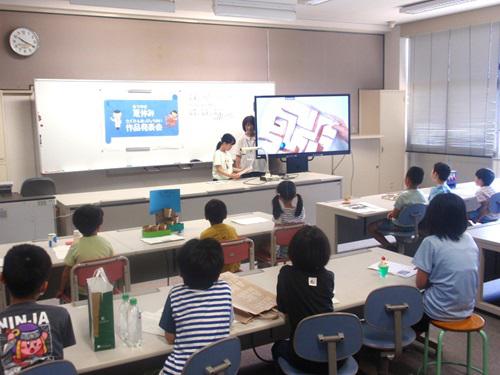 また、発表方法も様々で、作品を前に説明するだけでなく、書画カメラで細かい部分を拡大して提示したり、使い方や遊び方をみんなの前で実演して見せたり、タブレットでまとめたレポートを電子黒板に映し出してプレゼンテーションしたりするなど、それぞれが工夫を凝らしていました。