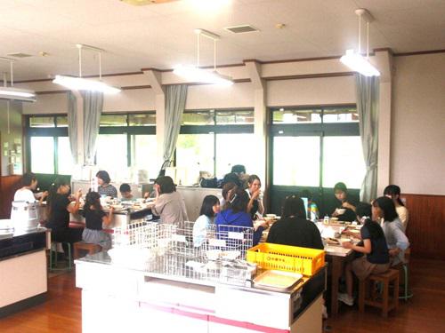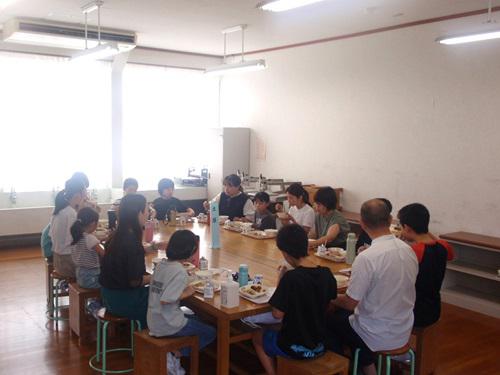 給食試食会では、地区ごとに分かれて親子で会食を行いました。「おいしいね」と微笑みあいながら食事をする姿に心が温かくなりました。