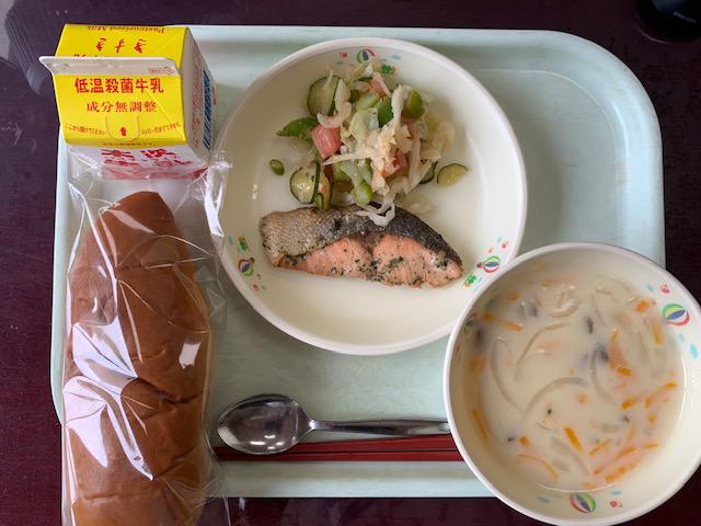 ○黒糖パン ○牛乳 ○鮭の香味焼き ○野菜サラダ ○お豆のポタージュ
