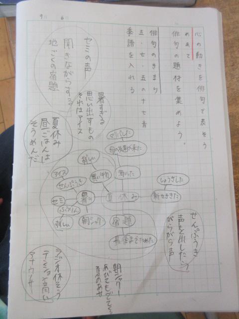 俳句のきまり(五・七・五の十七音であること、季語を入れることなど)を学習した子どもたちは、この時間のめあてである俳句の「題材集め」に取り組みました。