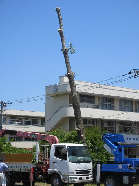 正午前に出張から帰るとすでに枝葉は取り払われ、幹だけが高くそびえる状態にありました。