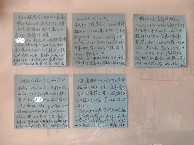 一クラスずつ読み終えると、担任宛に7.5cm角の付箋に指導に対する感謝の意を込めて簡単なコメントを付して返します。担任からこどもたちに適切にフィードバックすることで、こどもたちの意欲喚起につながれば望外の喜びです。