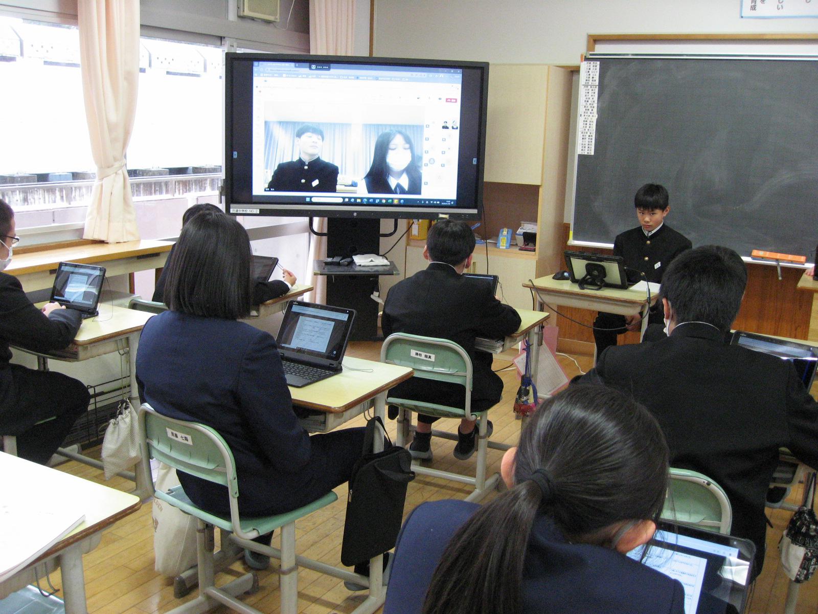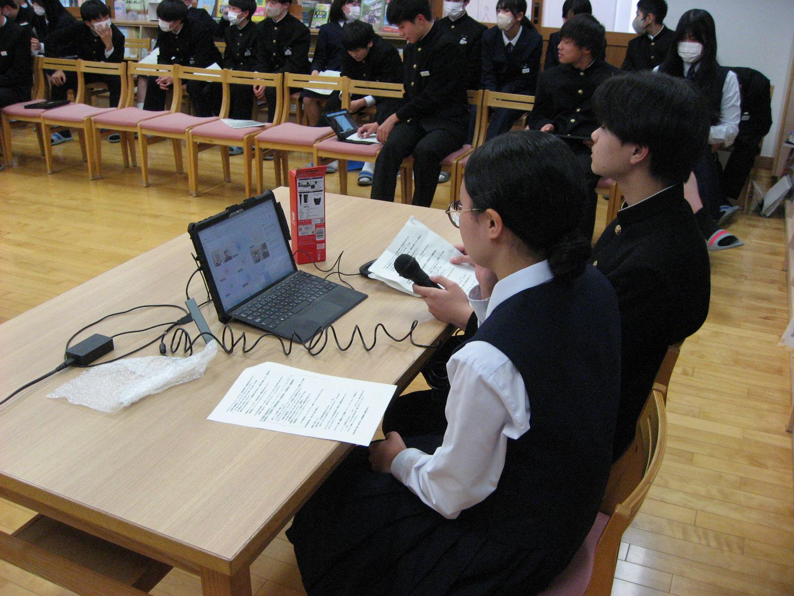 新旧生徒会の役員が図書館に集まり、リモートで各学級をつないで生徒総会を行いました。