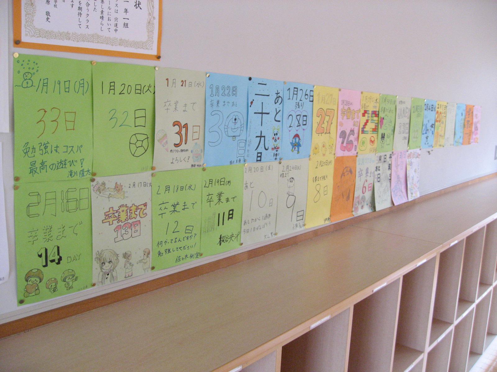 3年生の各クラスは、卒業式前の整備等を行っていました。そして卒業までのカウントダウンの絵が綺麗に飾られていました。