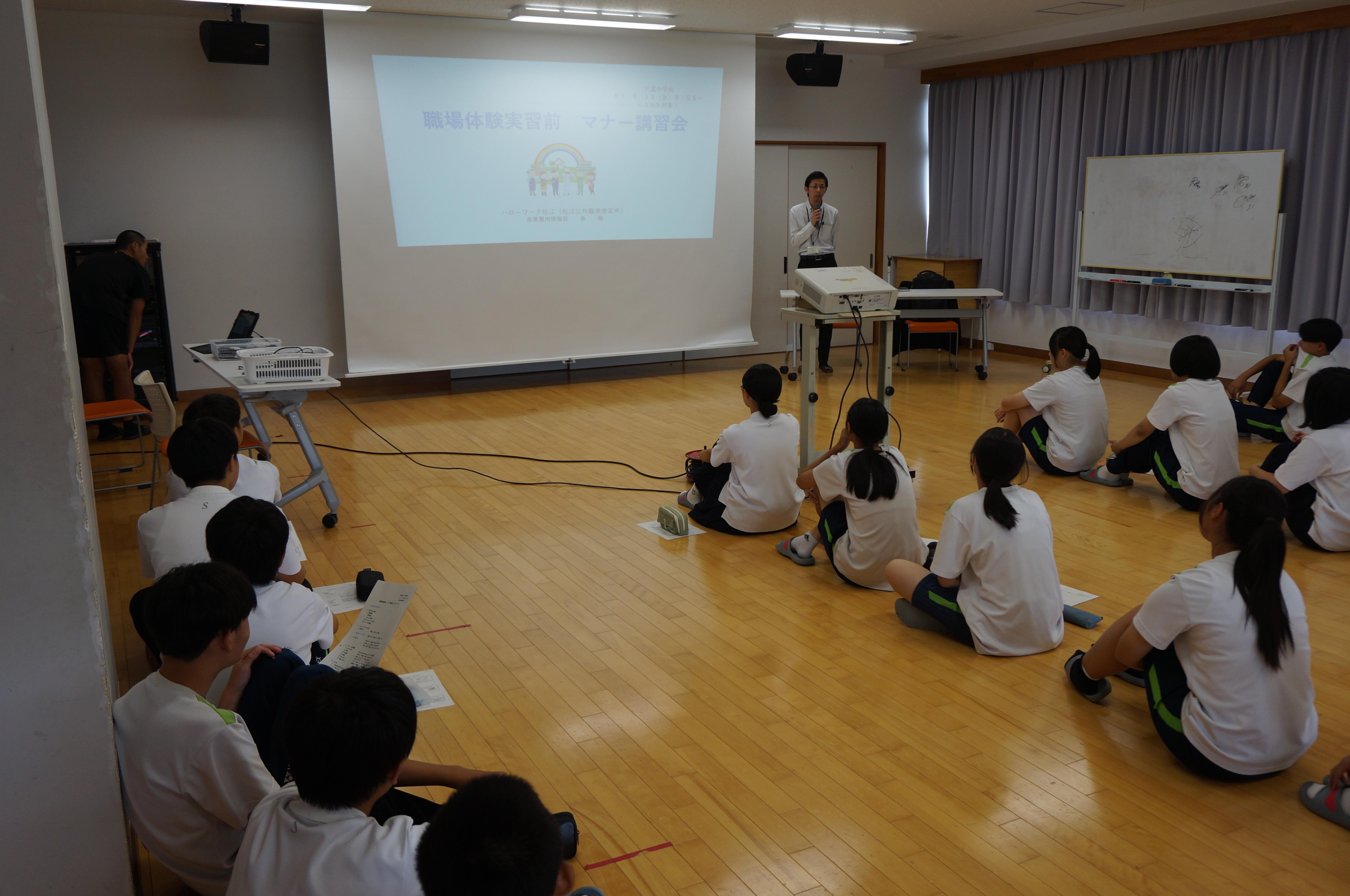 今日の2・3時間目は、3年生の「職場体験実習前 マナー講習会」がありました。