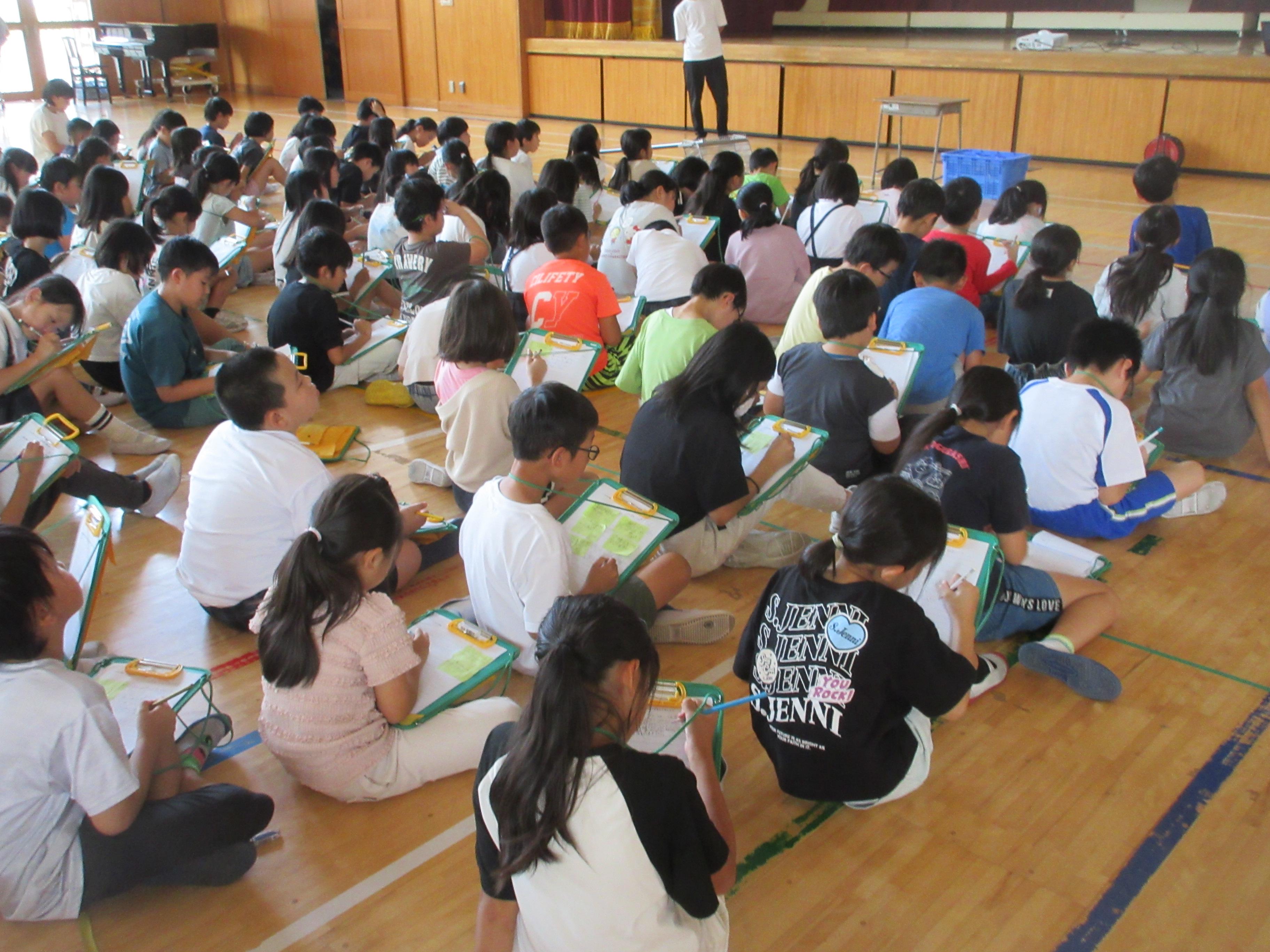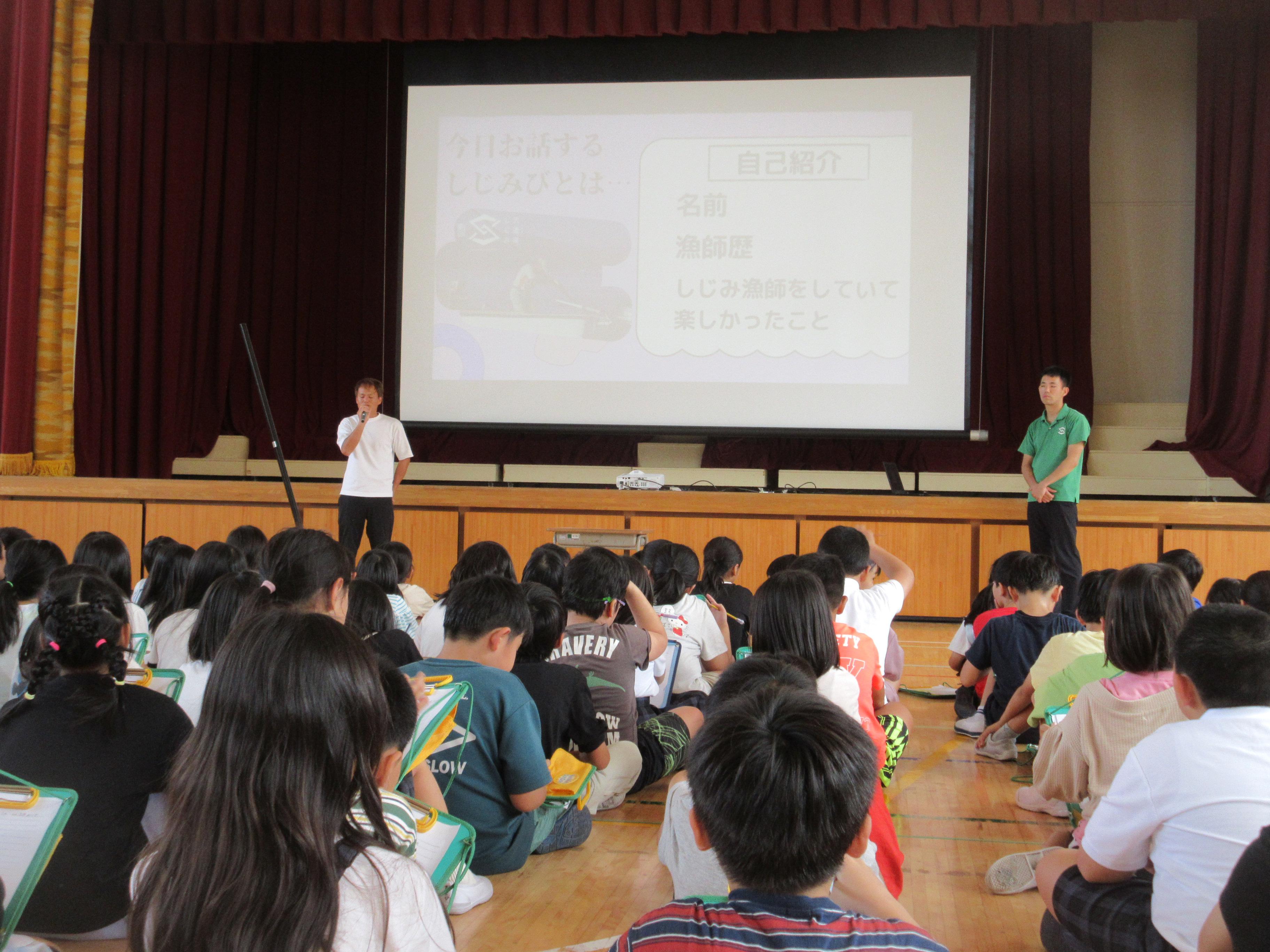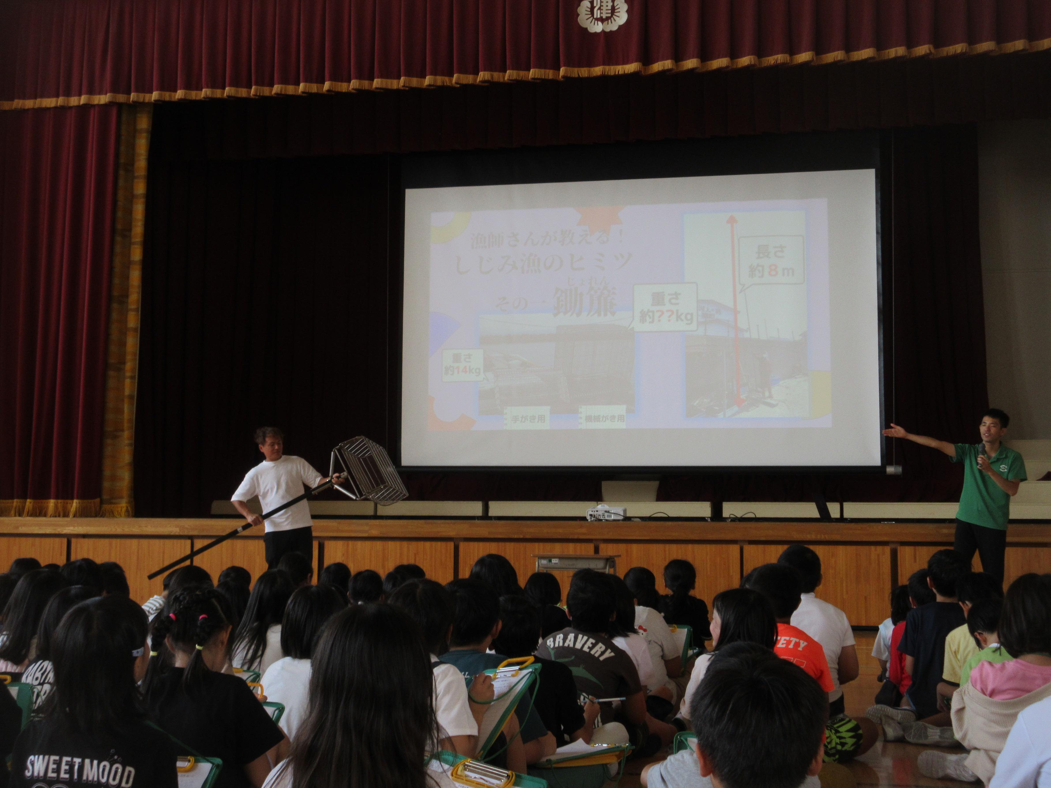 今日の午後、3年生は総合的な学習の時間で、しじみの学習に取り組みました。宍道湖漁協の方と実際にしじみ漁をしておられる方の2名をゲストティーチャーにお迎えして学習しました。宍道湖七珍やしじみ漁をするときの道具「鋤簾(じょれん)」について、しじみ漁の3つの方法やしじみ漁をする際のルールなどについてお話をしていただきました。子どもたちは熱心に聞きながらメモを取り、最後には積極的に質問しながら学習に取り組みました。