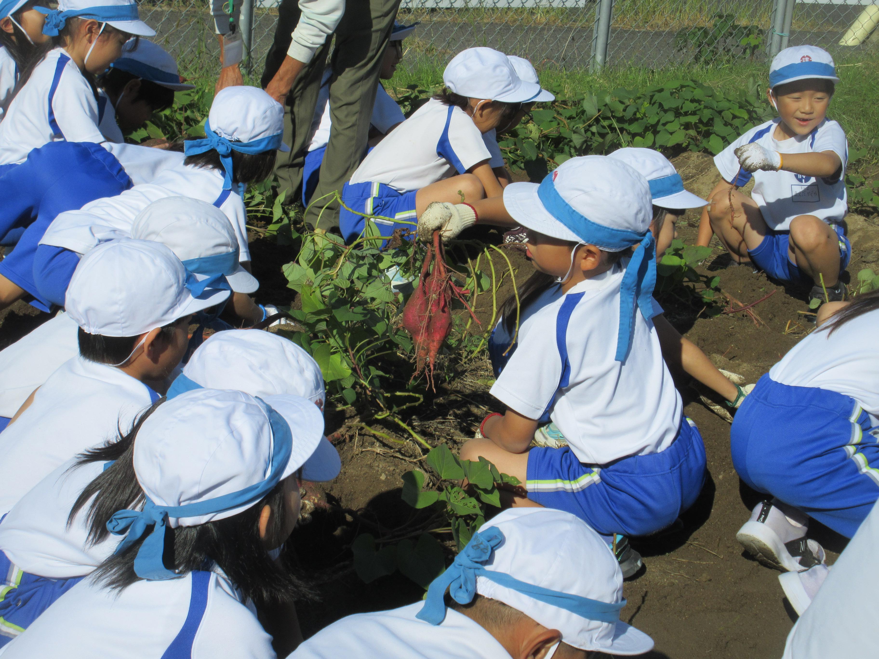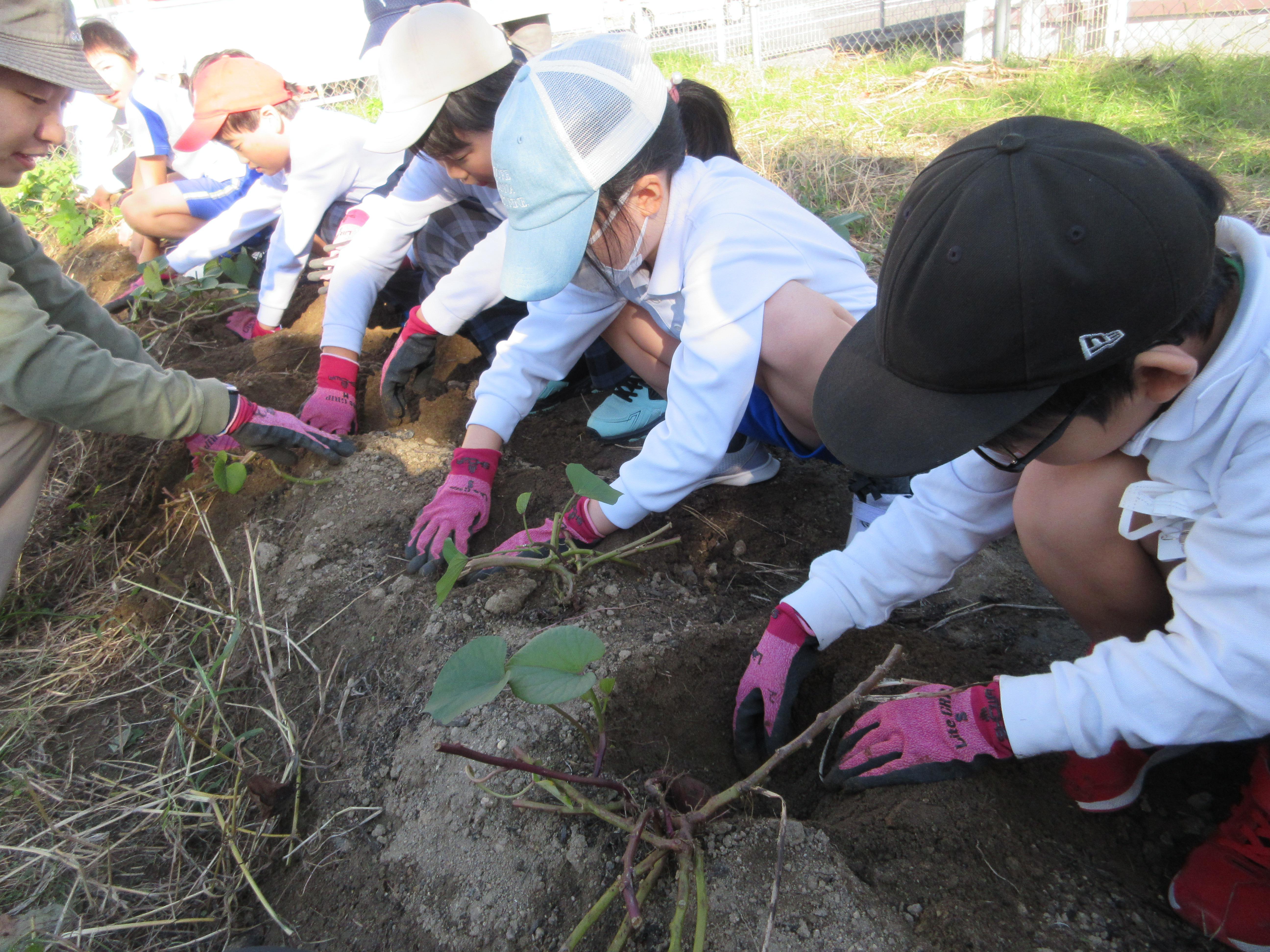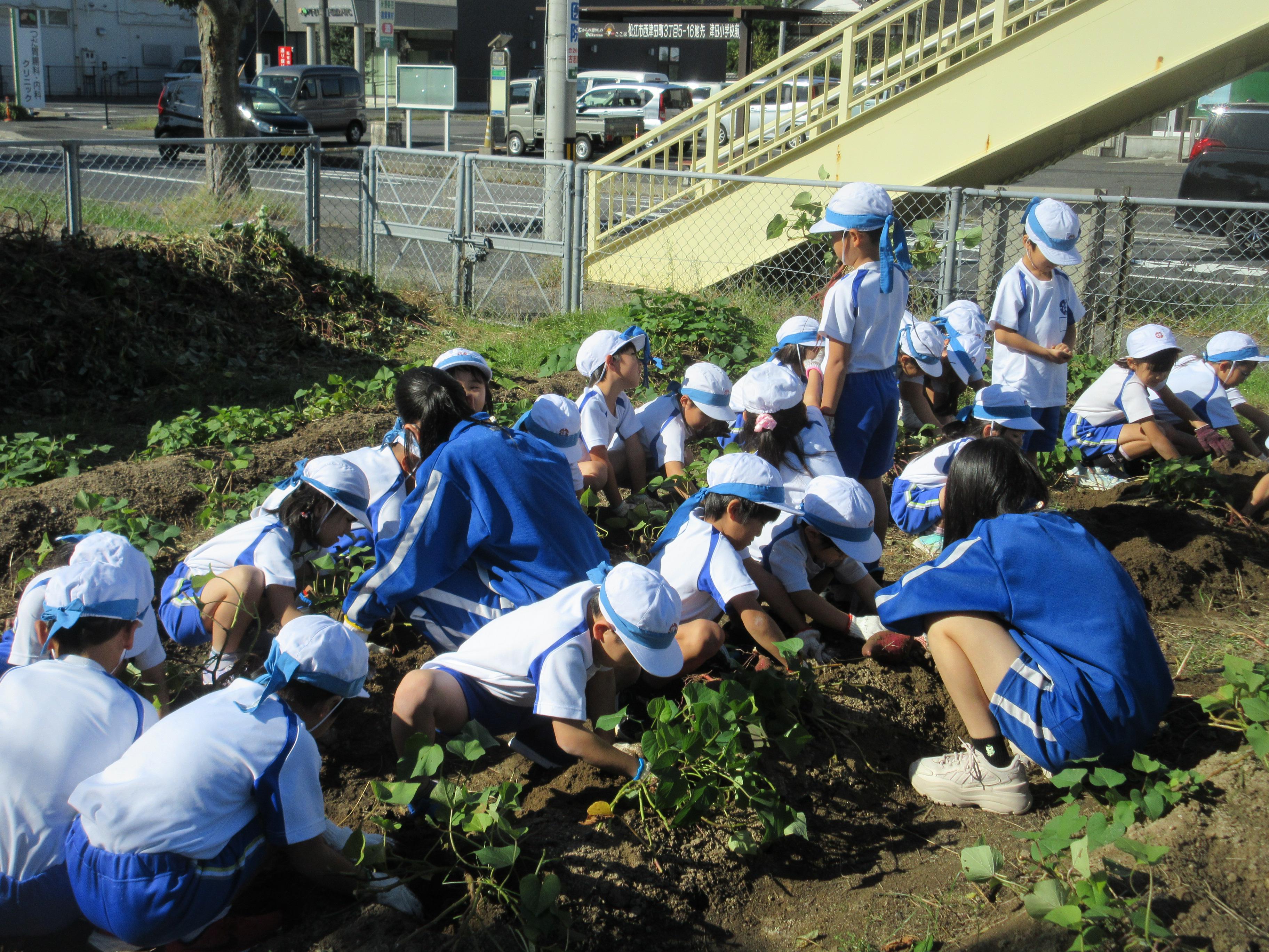朝からとてもさわやかな青空に包まれています。今日は、なかよし学級と1年生の子どもたちがいもほりをしました。地域ボランティアの方から掘り方のお話を聞いてスタートしました。掘り始めてみたもののなかなかサツマイモは出てきません。「まだ掘るの?」「いもはあるの?」と聞いてくる子もいました。そしてどんどん掘っていくと、やっとサツマイモと出会い、さらに掘り続けていくと「やったー!獲れた~!」「ぼく4個獲れた~!」と大喜びの声。喜びの声の輪がどんどん広がっていきました。 ![]()