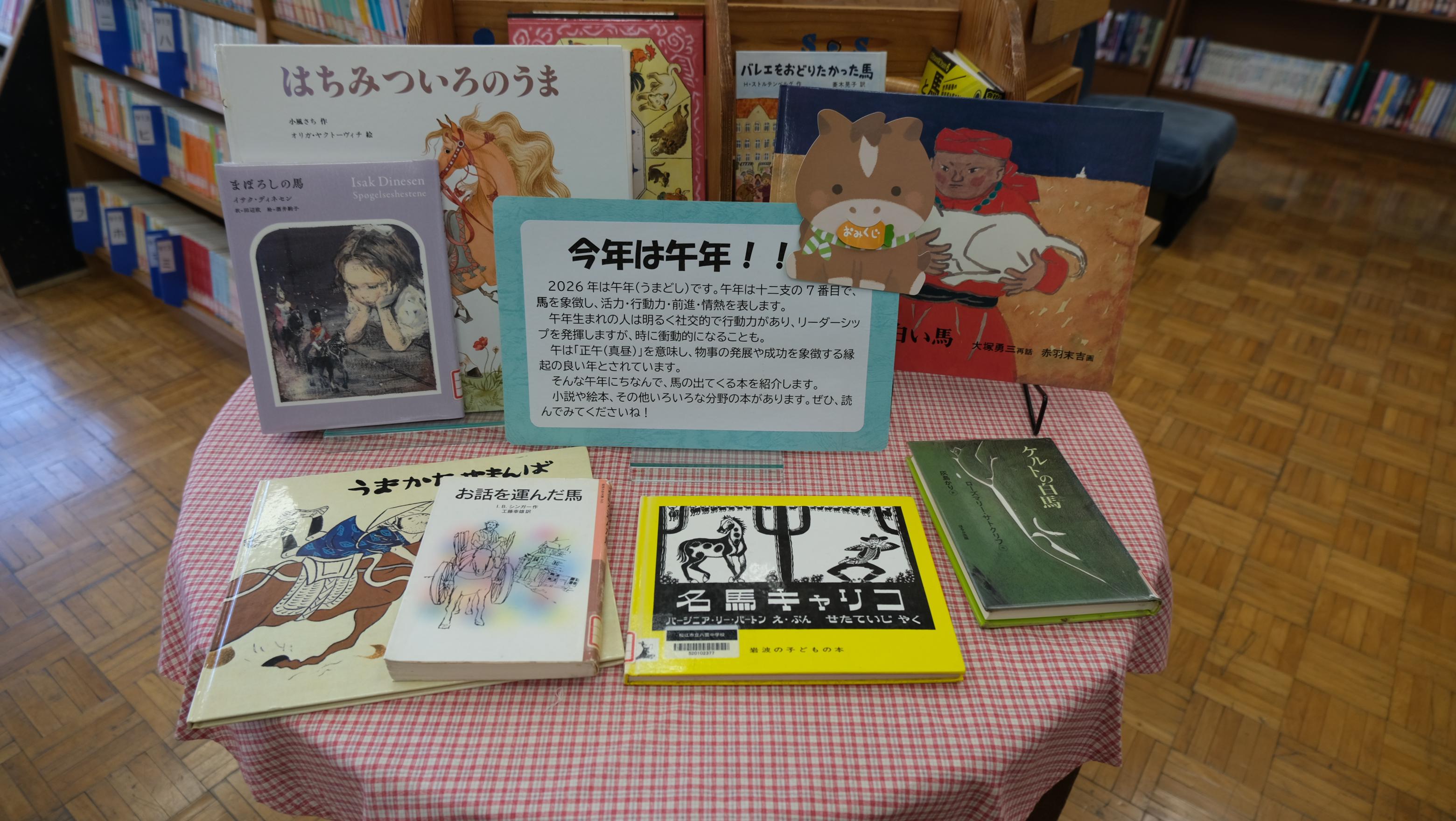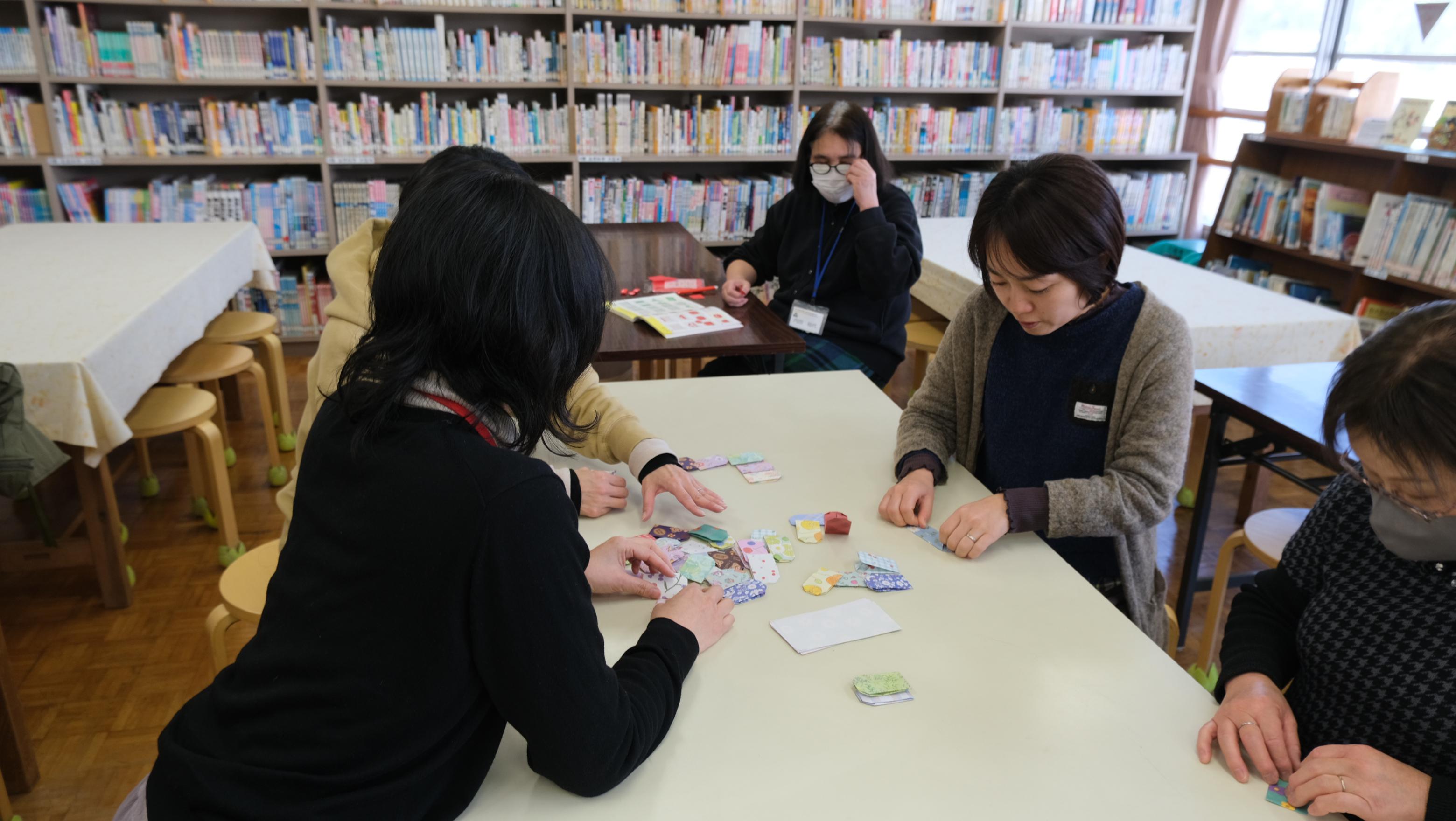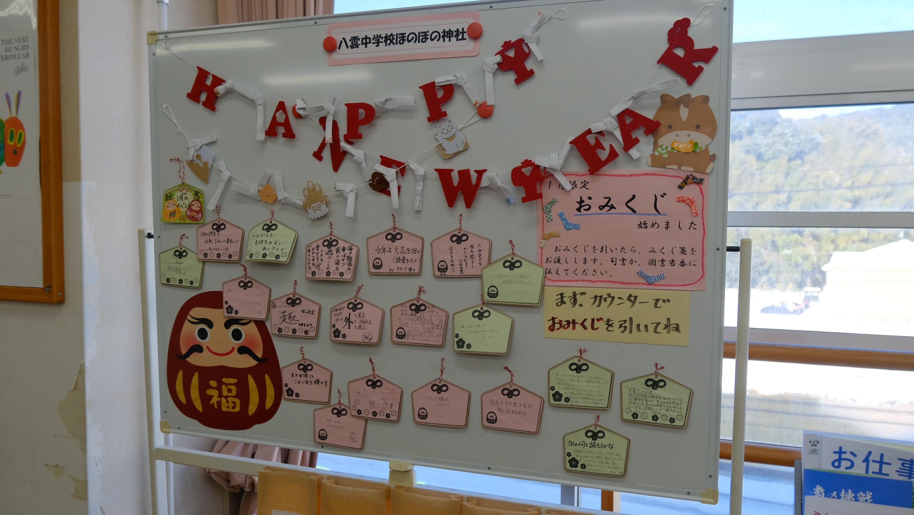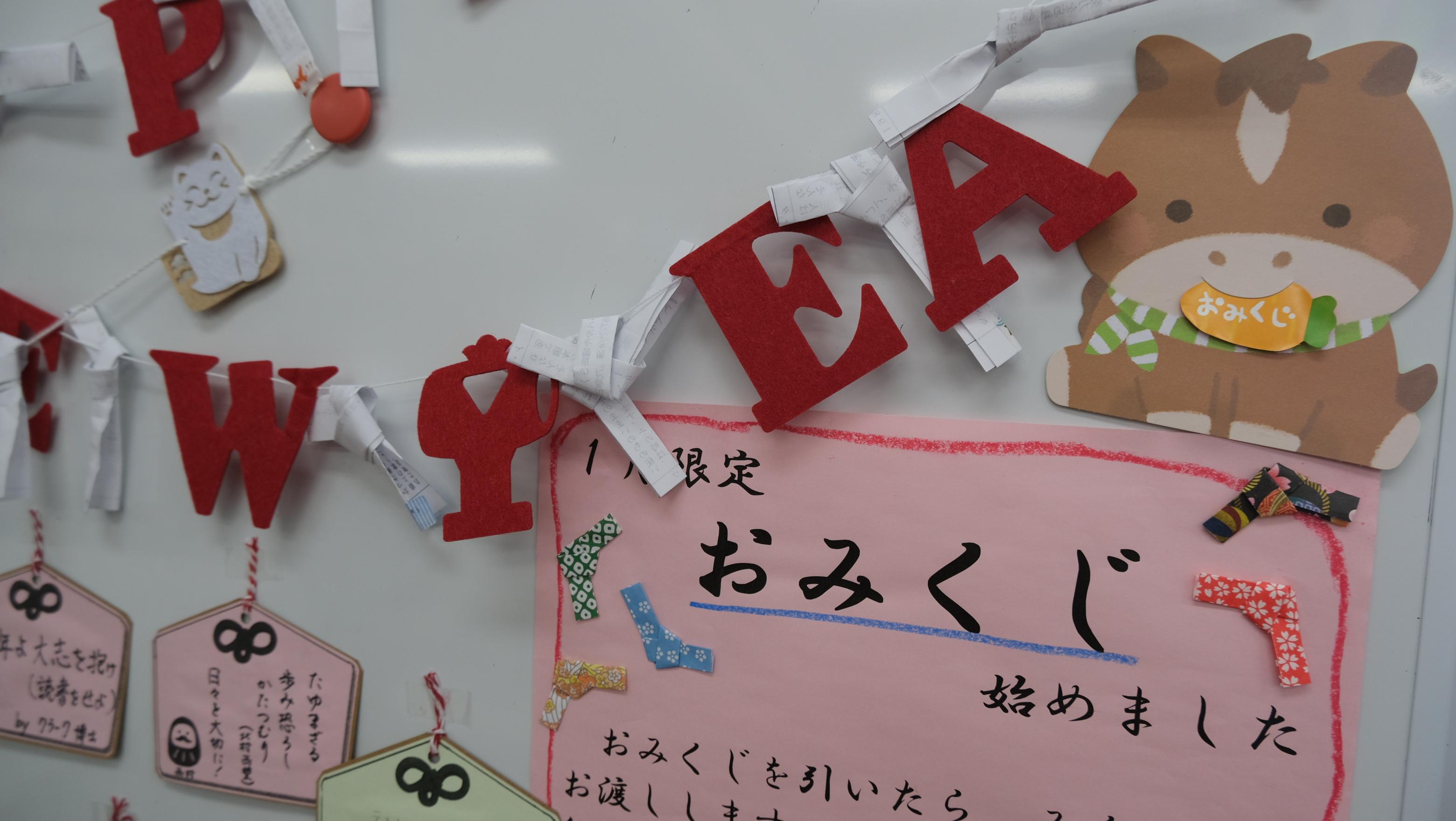 本日(1/22)は、雪の朝となりました。駐車場には積雪があり、生徒も出て雪かきをしてくれました。今日は図書館ボランティアの日で、4名の方に来校していただきました。1月のボランティア活動では、3年生に渡す「御守り」づくりをしていただきました。折り紙を使って御守りを作り、飾りにだるまをあしらった紙を貼り付けて完成します。3年生全員分ができたらプレゼントされるようです。図書館では、1月の飾りつけで絵馬やおみくじ、午年など、工夫を凝らしています。