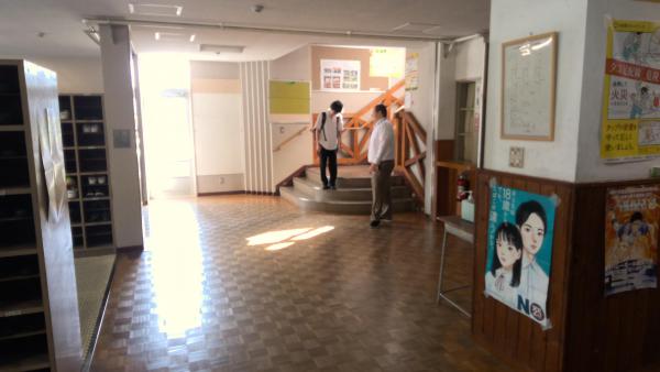 昇降口に入るとALTが皆さんを待ち構えていました。当然「Good morning! How are you?」への返しを求められます。礼儀正しく(?)頭を下げながら「グッドモーニング...」と応える生徒の姿が微笑ましかったです。