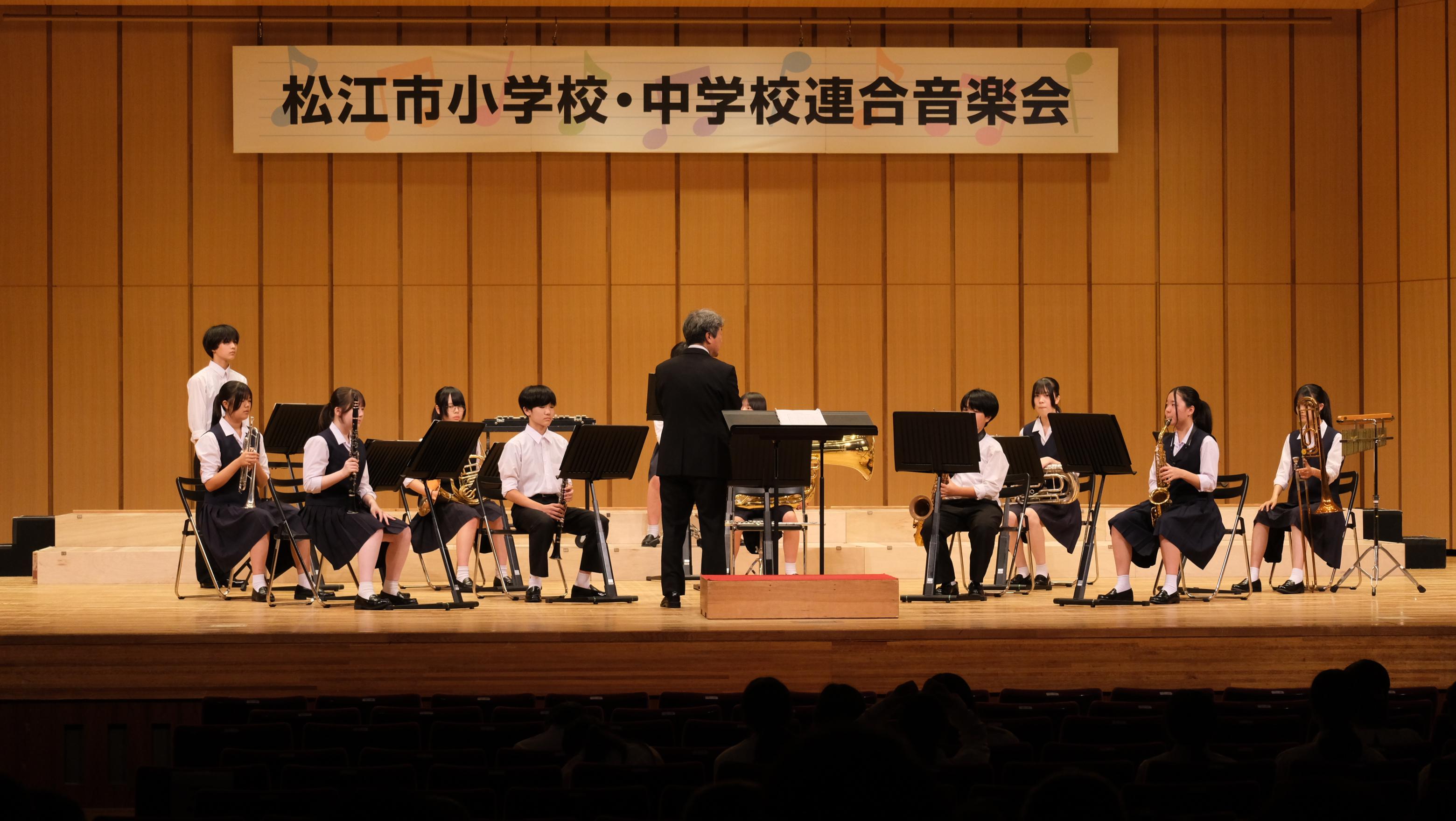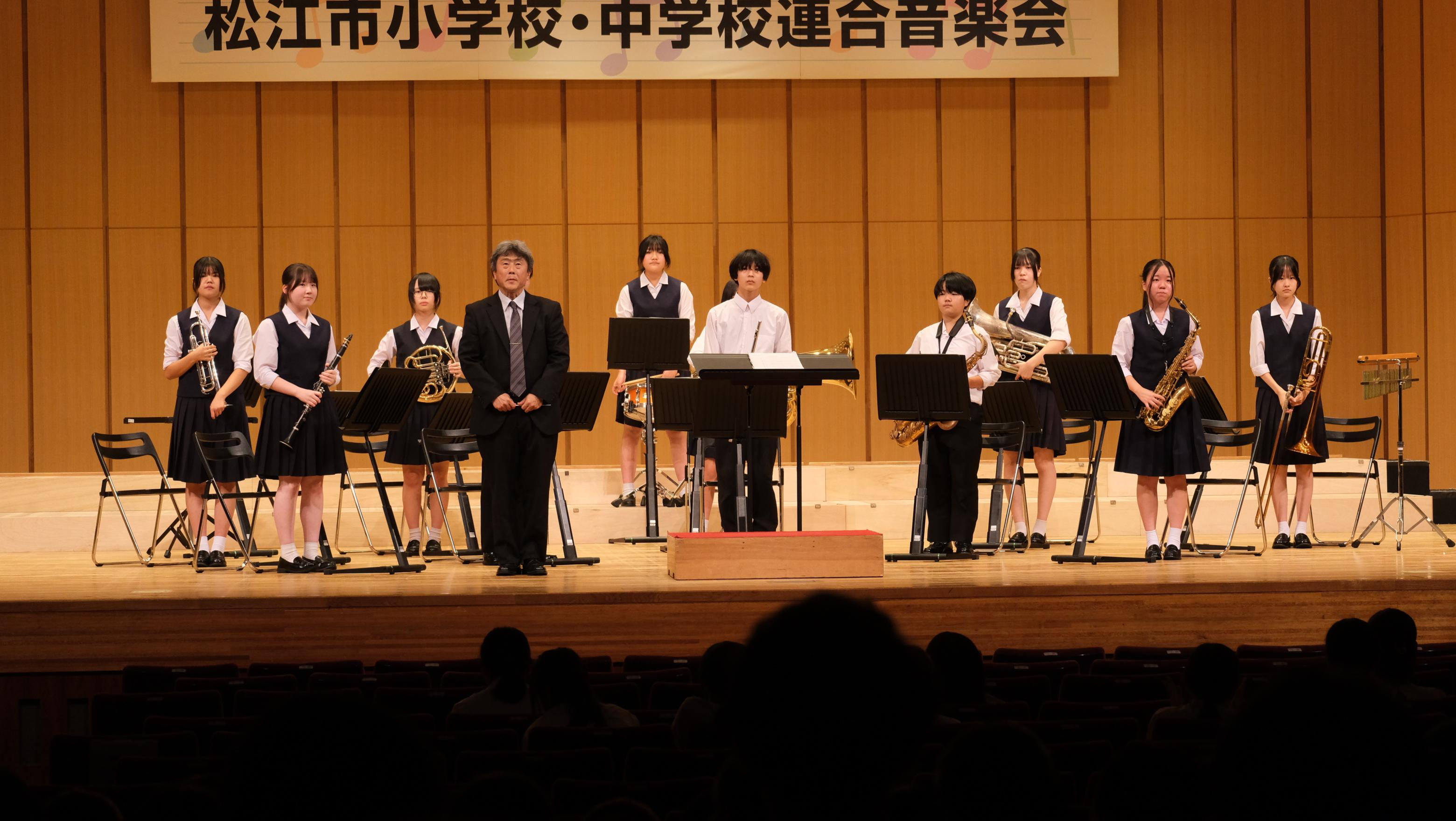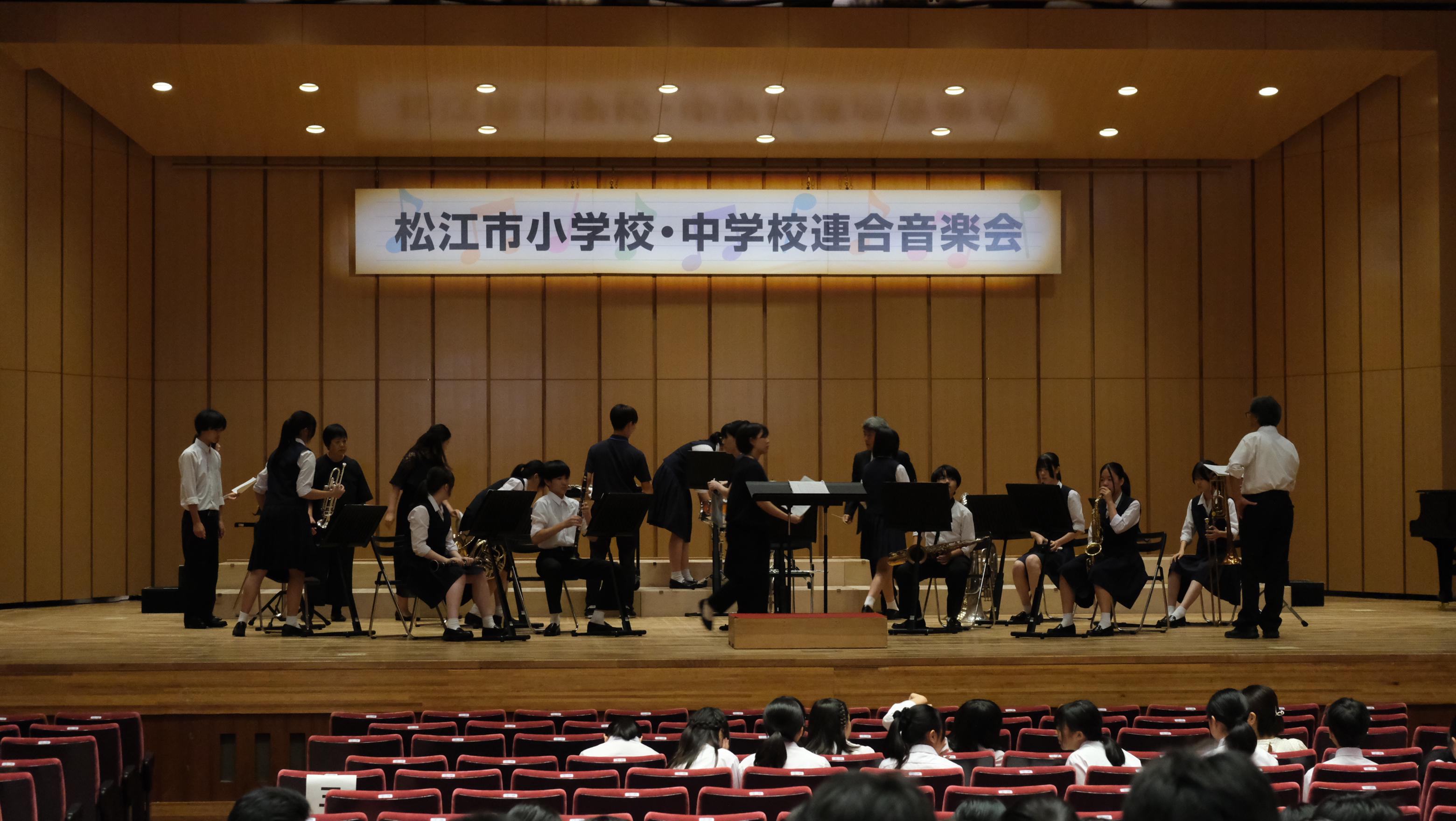 昨日(10/8)、島根県民会館において、松江市小学校・中学校連合音楽会が開催されました。八雲中学校は午後の部の4番目に出演し、「スター・ファンタジー」を演奏しました。この曲は、先月行われた定期演奏会で1,2年生が演奏した曲で、生徒たちは今回の音楽会に向けてさらに練習を重ねました。本番では2年生が1年生をリードし集中して演奏に臨んでいました。1年生に感想を聞いてみると、自分なりの課題も見つかり今後の練習に活かしていきたいと言っていました。
