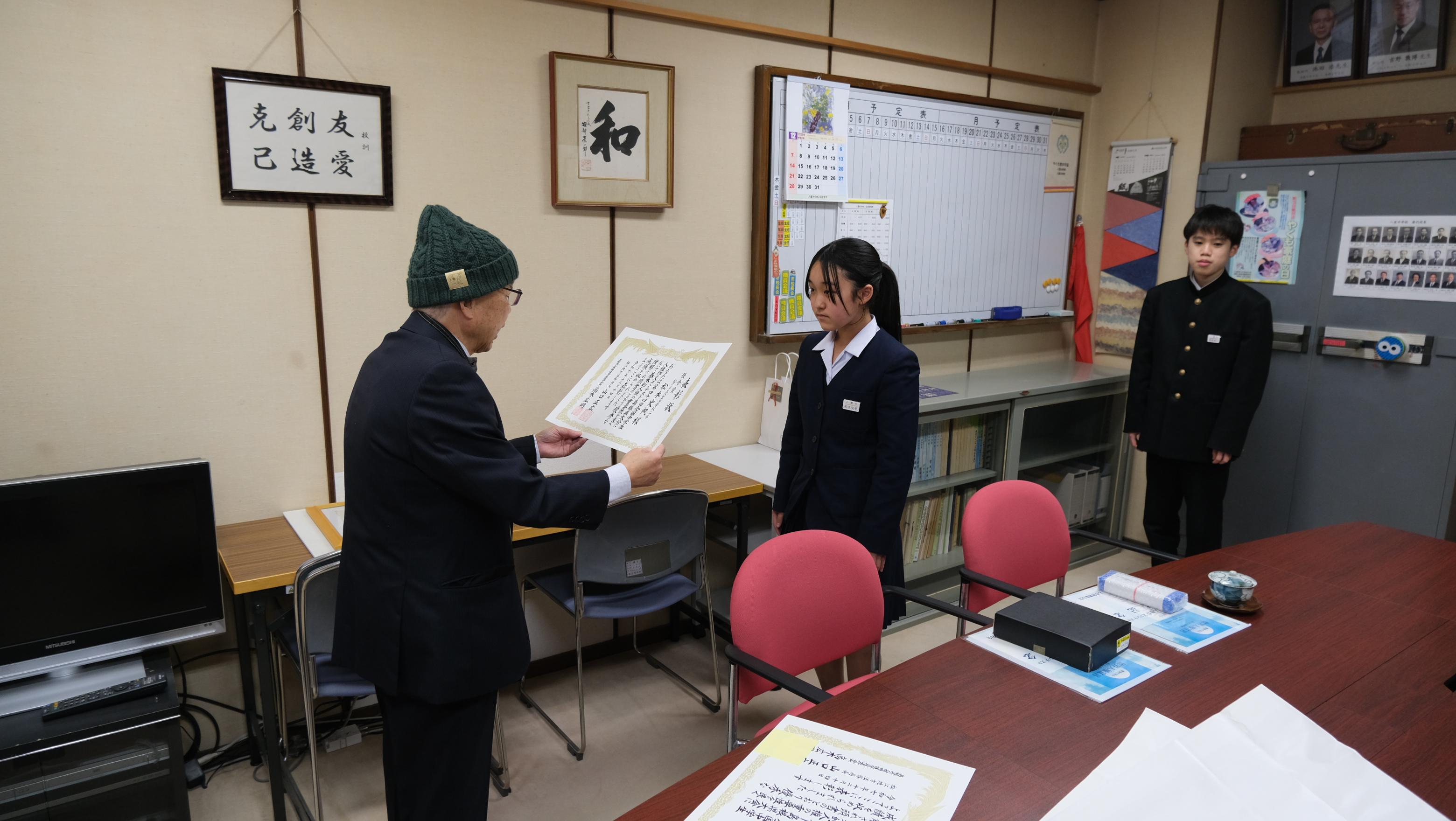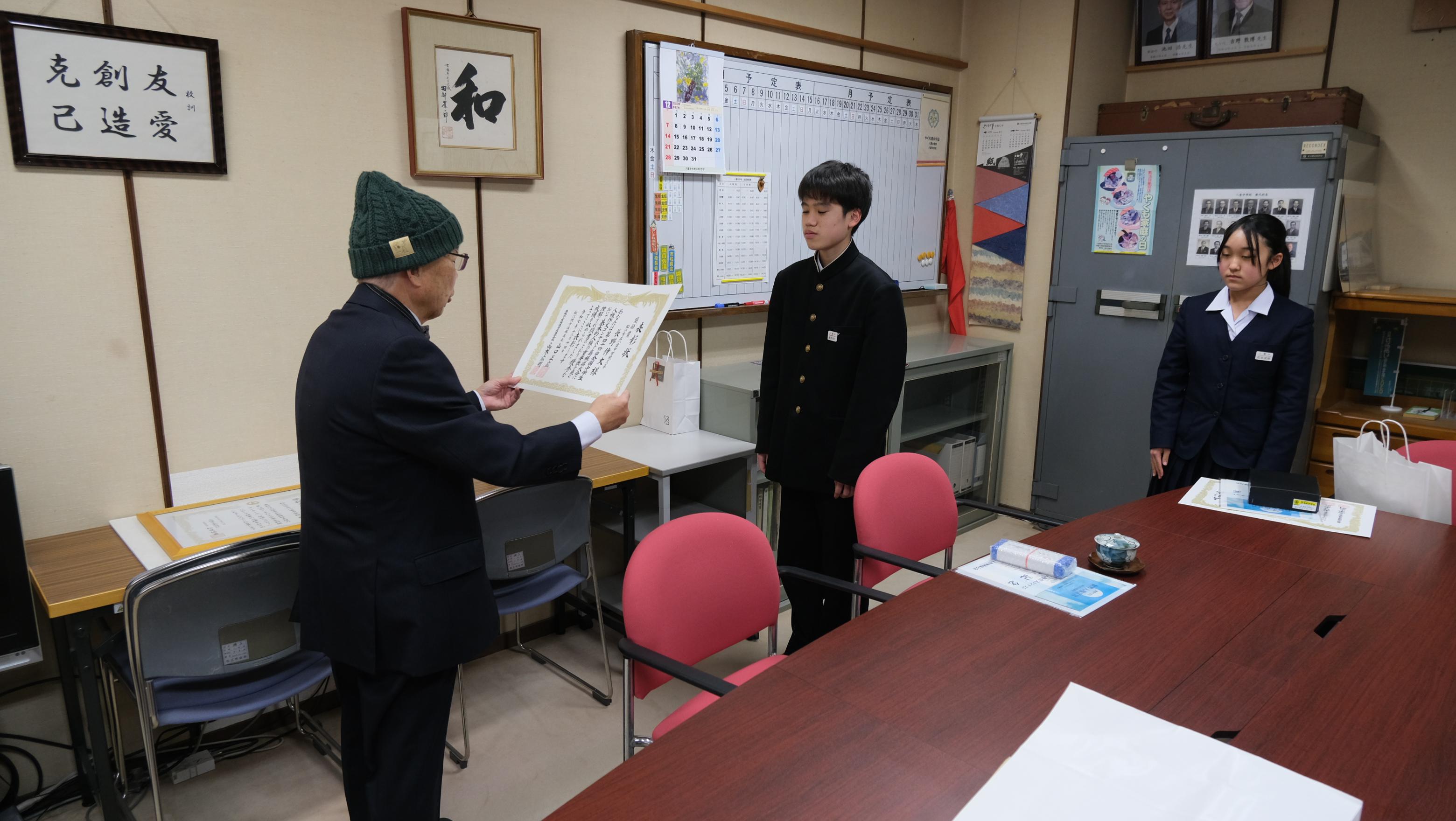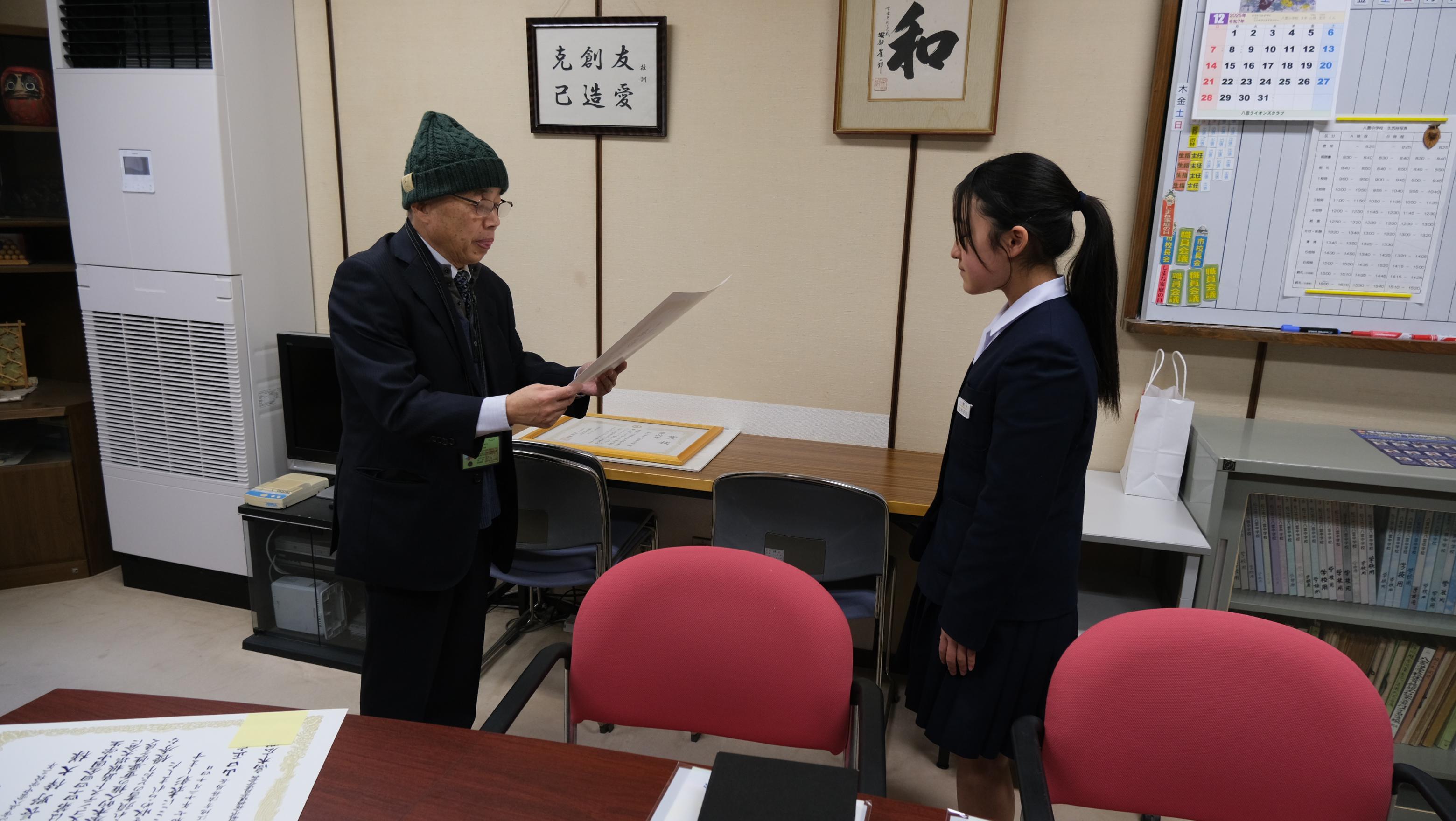 16日(火)島根県人権作文コンクールにおいて受賞した2名の生徒が表彰を受けました。優秀賞の生徒は、14日に行われた島根県人権フェスティバルin出雲で表彰を受ける予定でしたが、参加できなかったため学校で賞状を受け取りました。2人の生徒は、賞状と記念品を八雲町人権教育推進協議会会長さんより受け取りました。