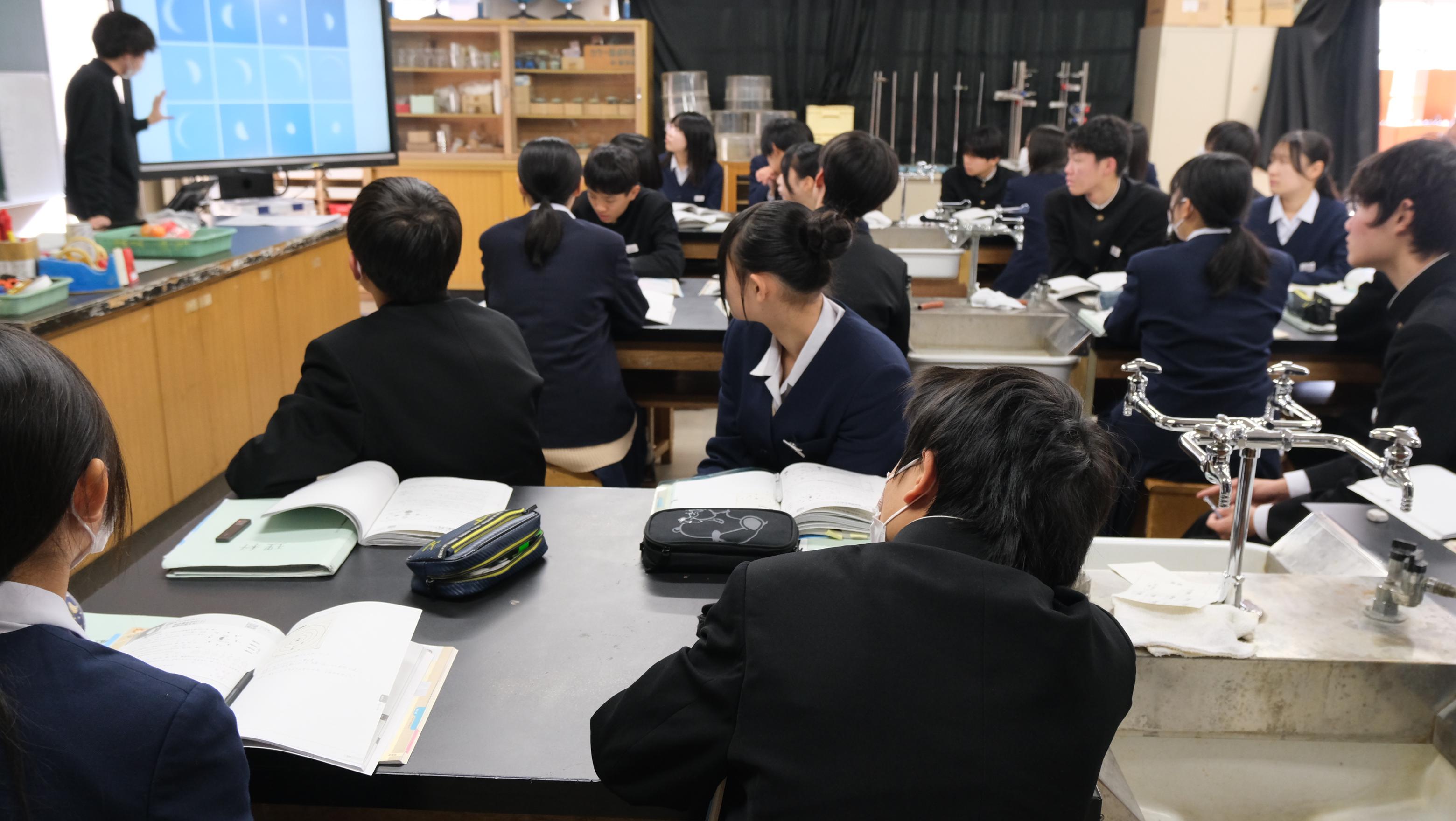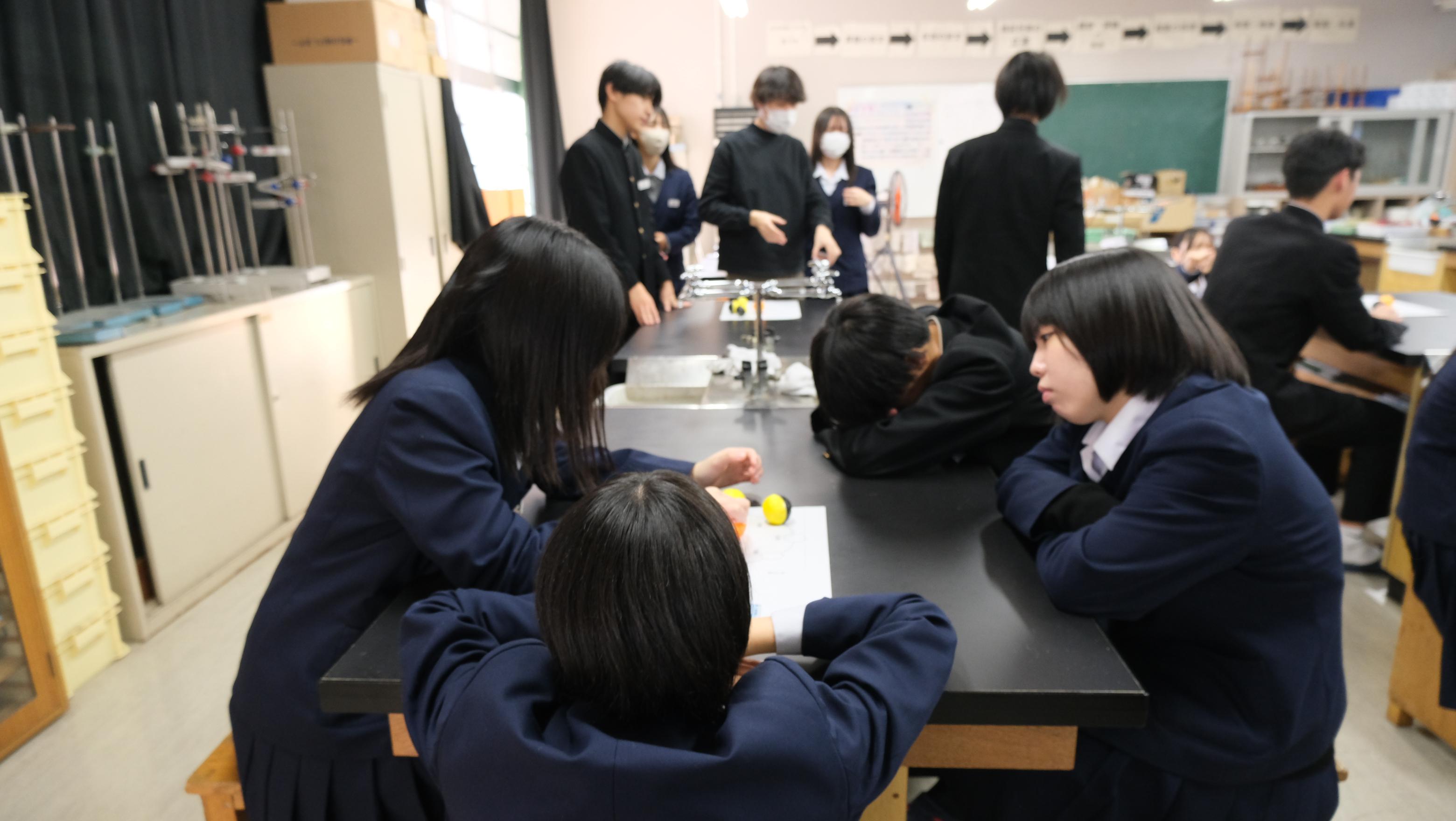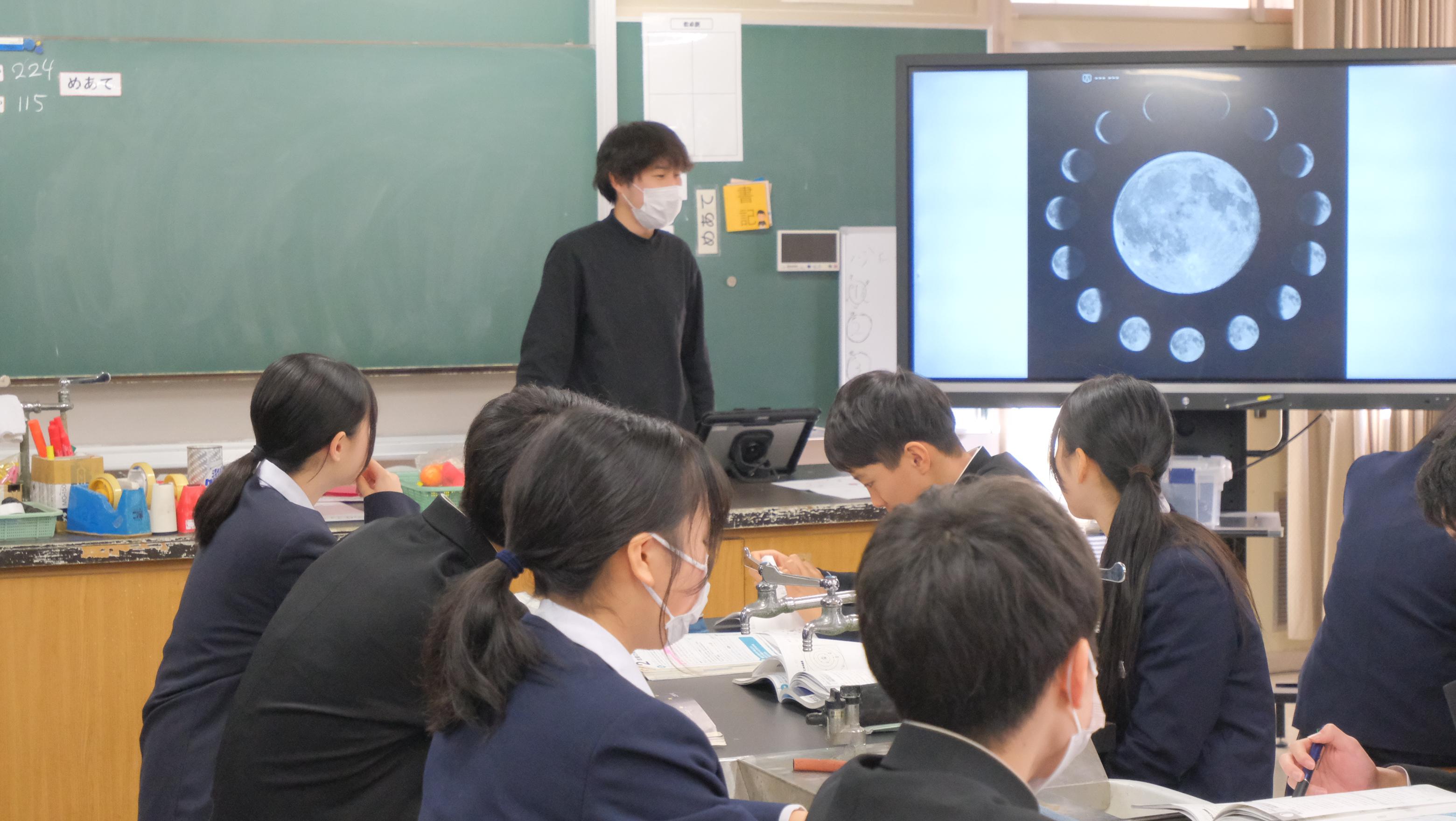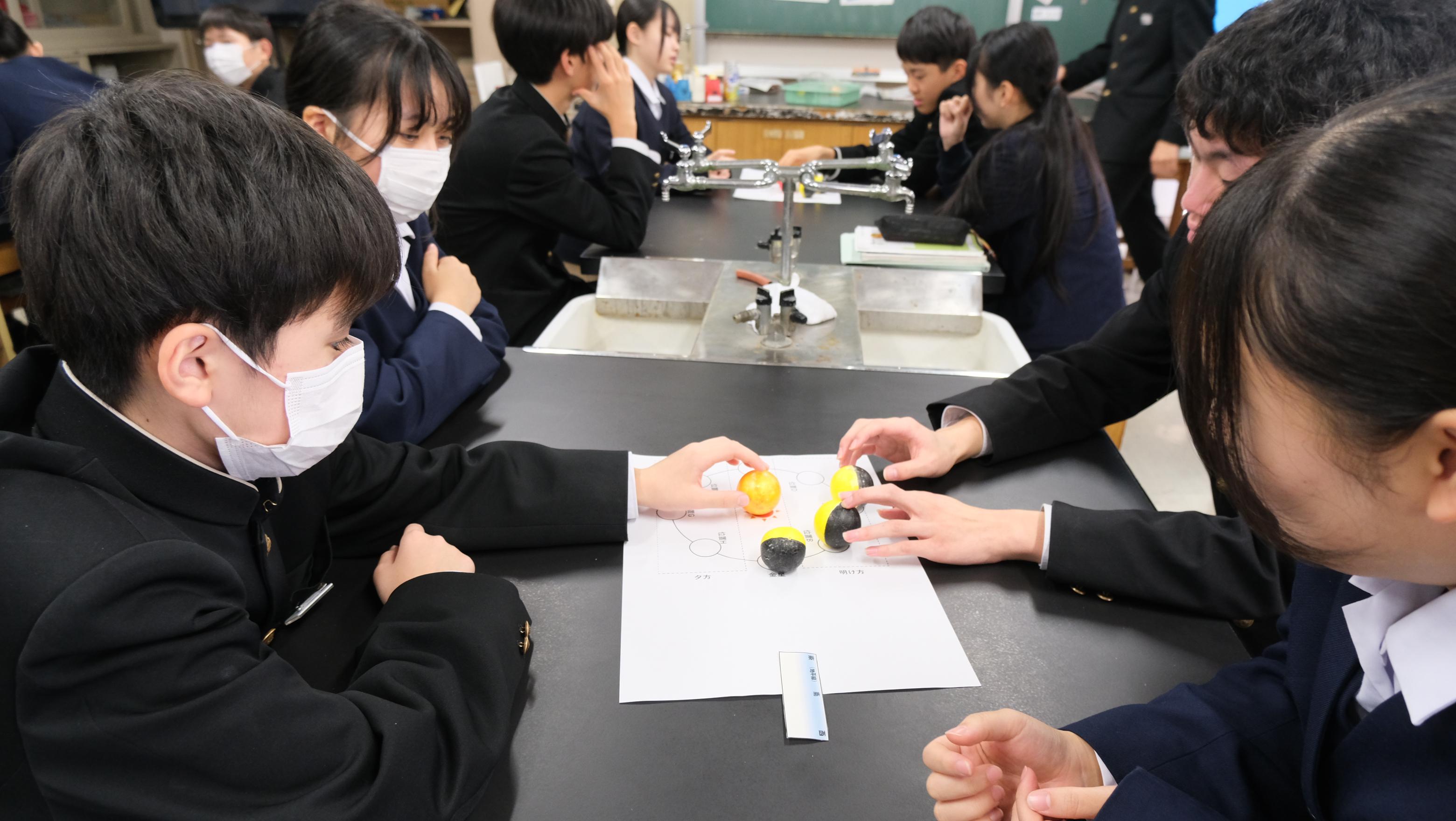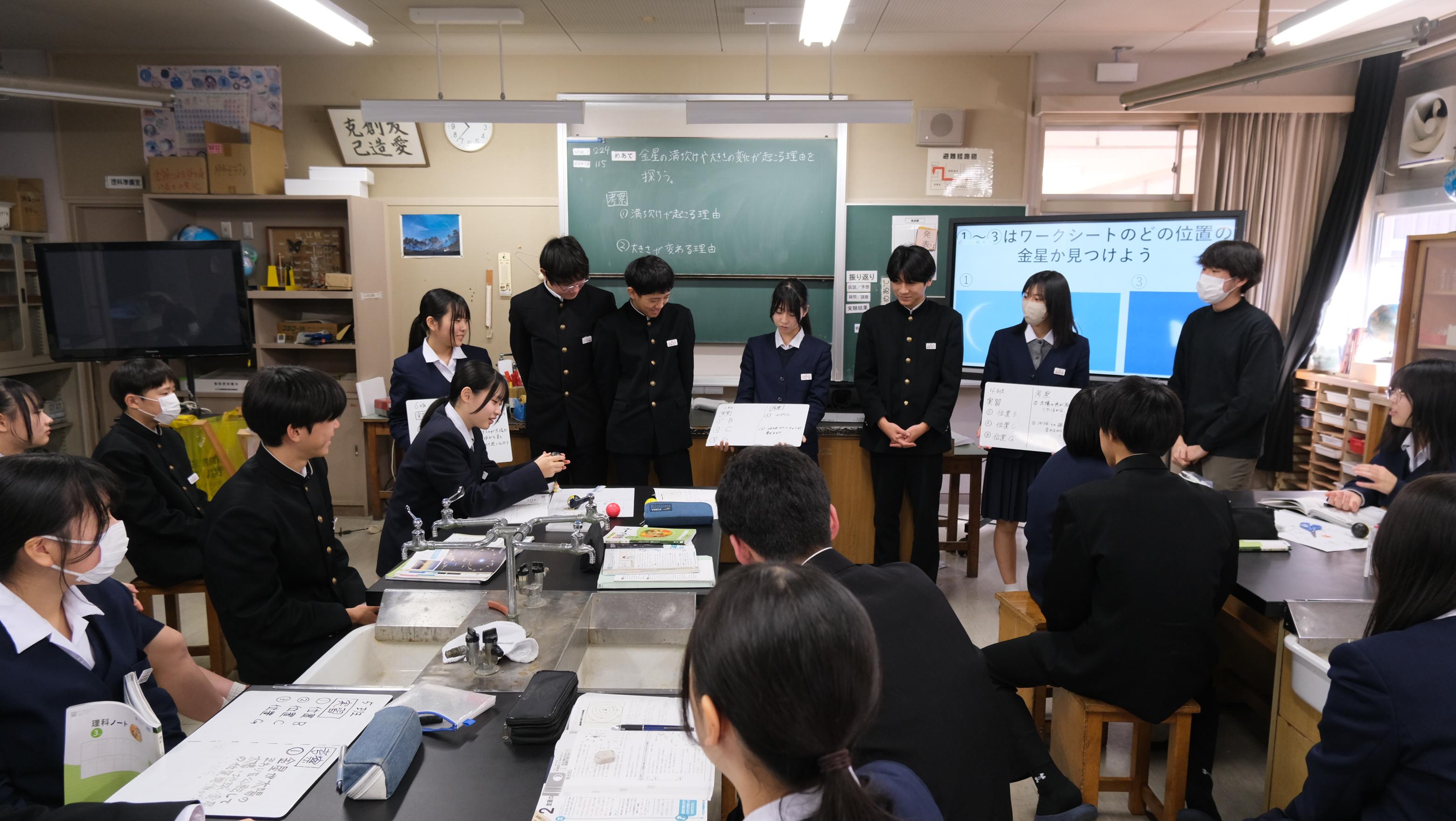 18日(木)3年1組理科の授業で、研究授業が行われました。内容は「地球と宇宙」月と金星の見え方で、太陽の位置と地球の位置、金星の位置によって金星の見え方がどのように変わるのか考える授業でした。生徒たちは太陽と金星のモデルを使って見え方がどのように変化するのか考察し、理由をグループで話し合って発表しました。先生方も授業力向上を目指して、研修を重ねています。