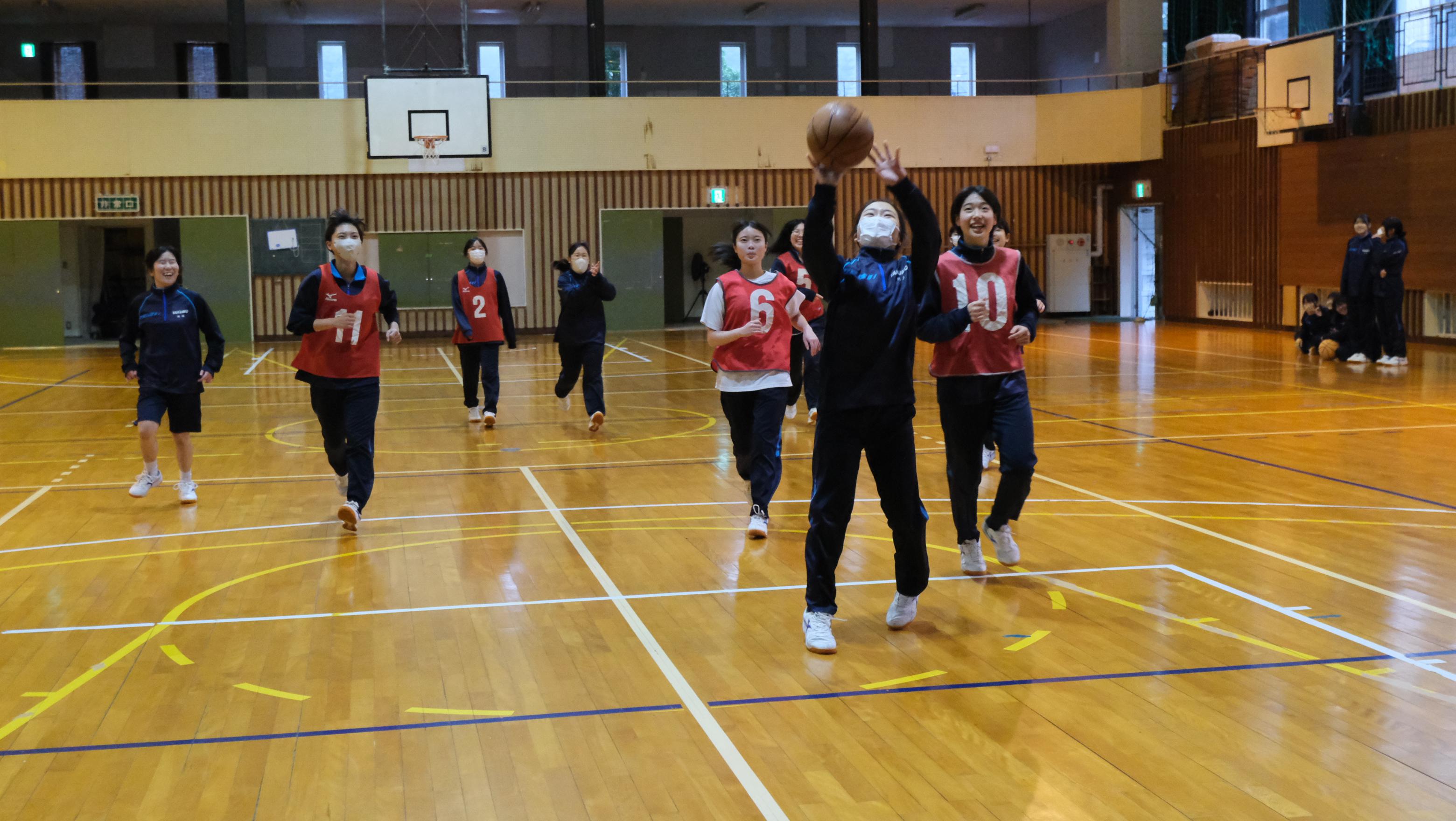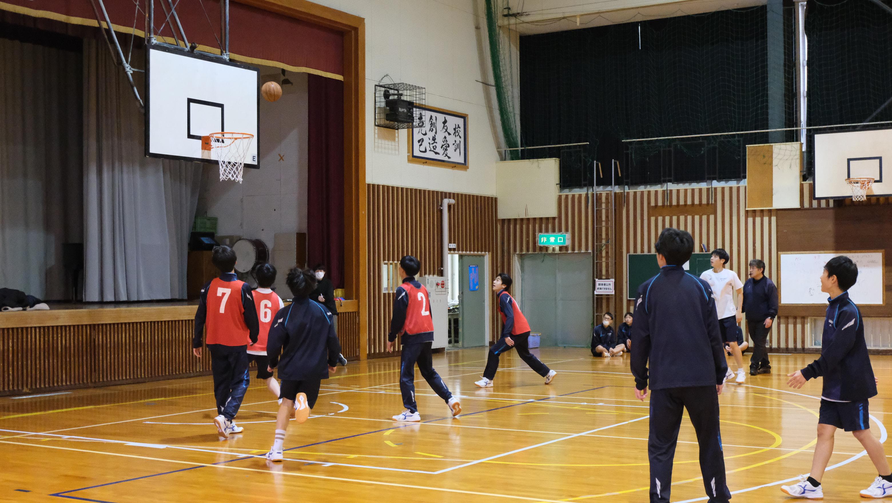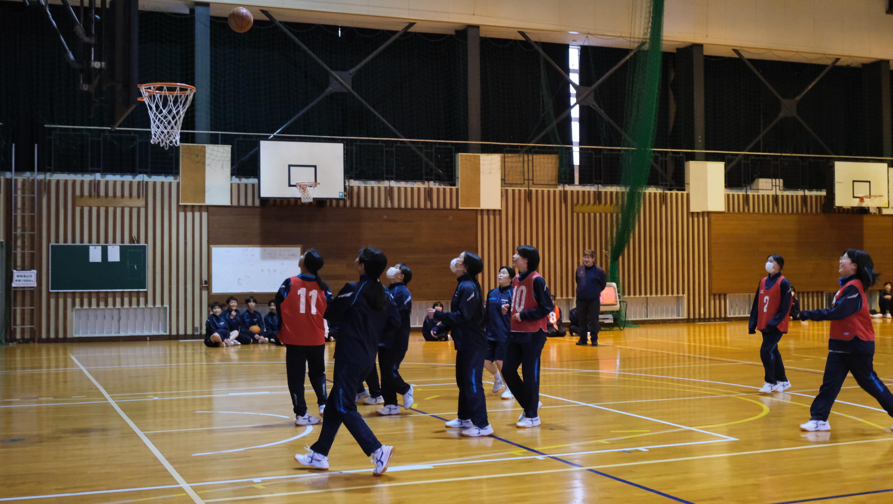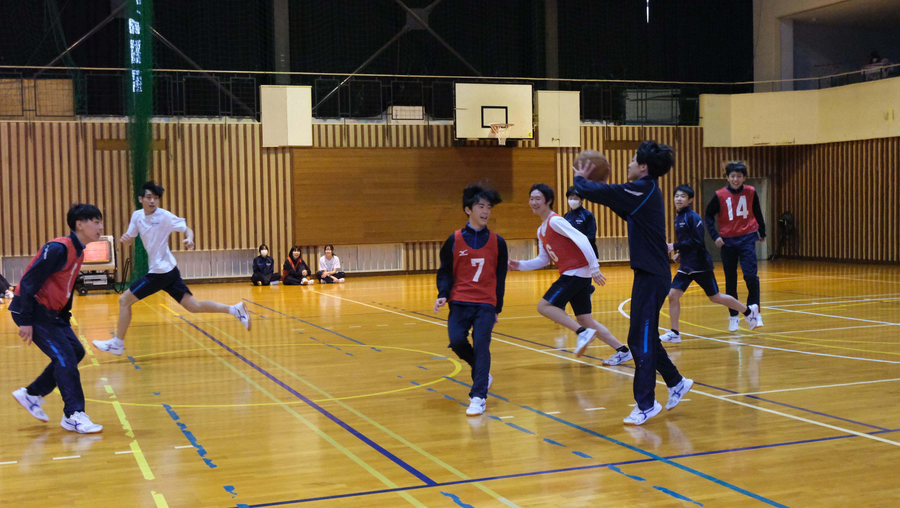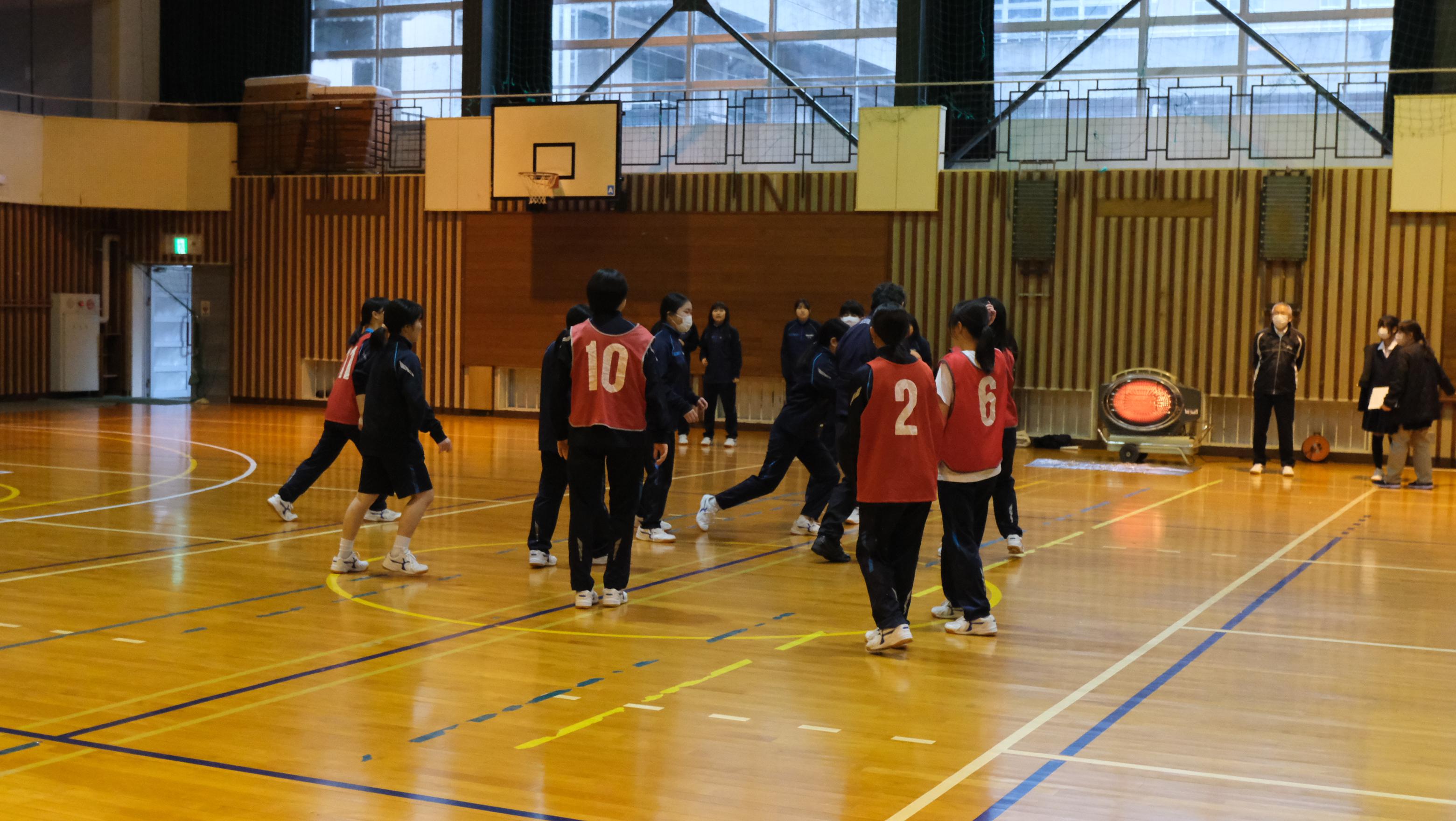 先週の昼休みから、3年生はバスケットボールに熱中していました。本日(12/24)、体調不良で欠席の生徒が数名いましたが、球技大会が行われました。5分間の試合、3分間の休憩・作戦タイムのタイムテーブルで1組と2組の対戦が行われました。競技の進め方の説明を聞き、アップの時間を終えて、女子のチームから試合が開始しました。1組はバスケットの経験者がおり次々とシュートを決めていましたが、2組も負けじとシュートを決めていました。続いて男子の対戦が行われました。素早いパスやドリブルで動きのある試合となり、次々と得点が決まっていました。途中ではスリーポイントシュートが決まるなど、プロバスケットボールばりの試合展開となりました。