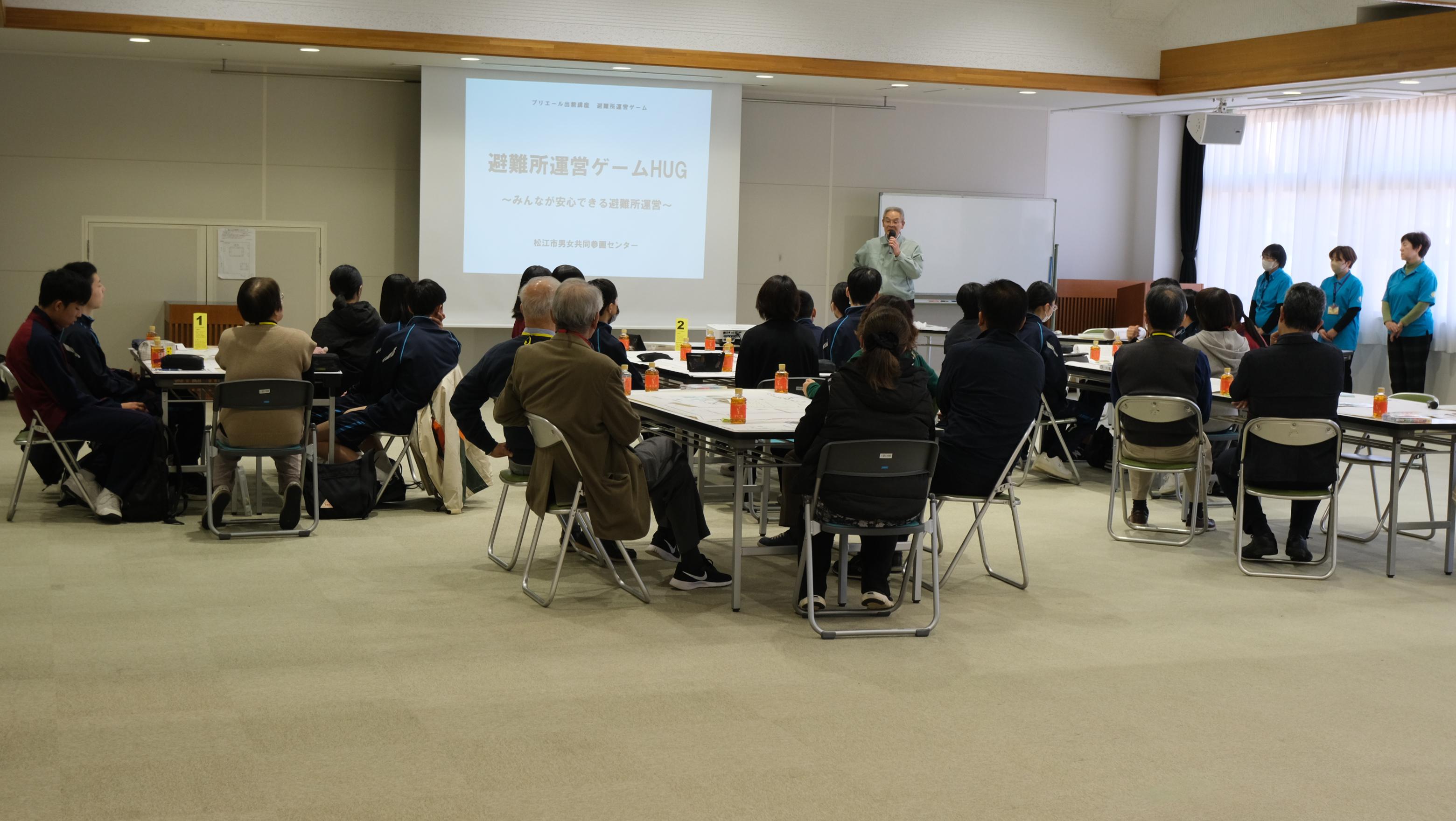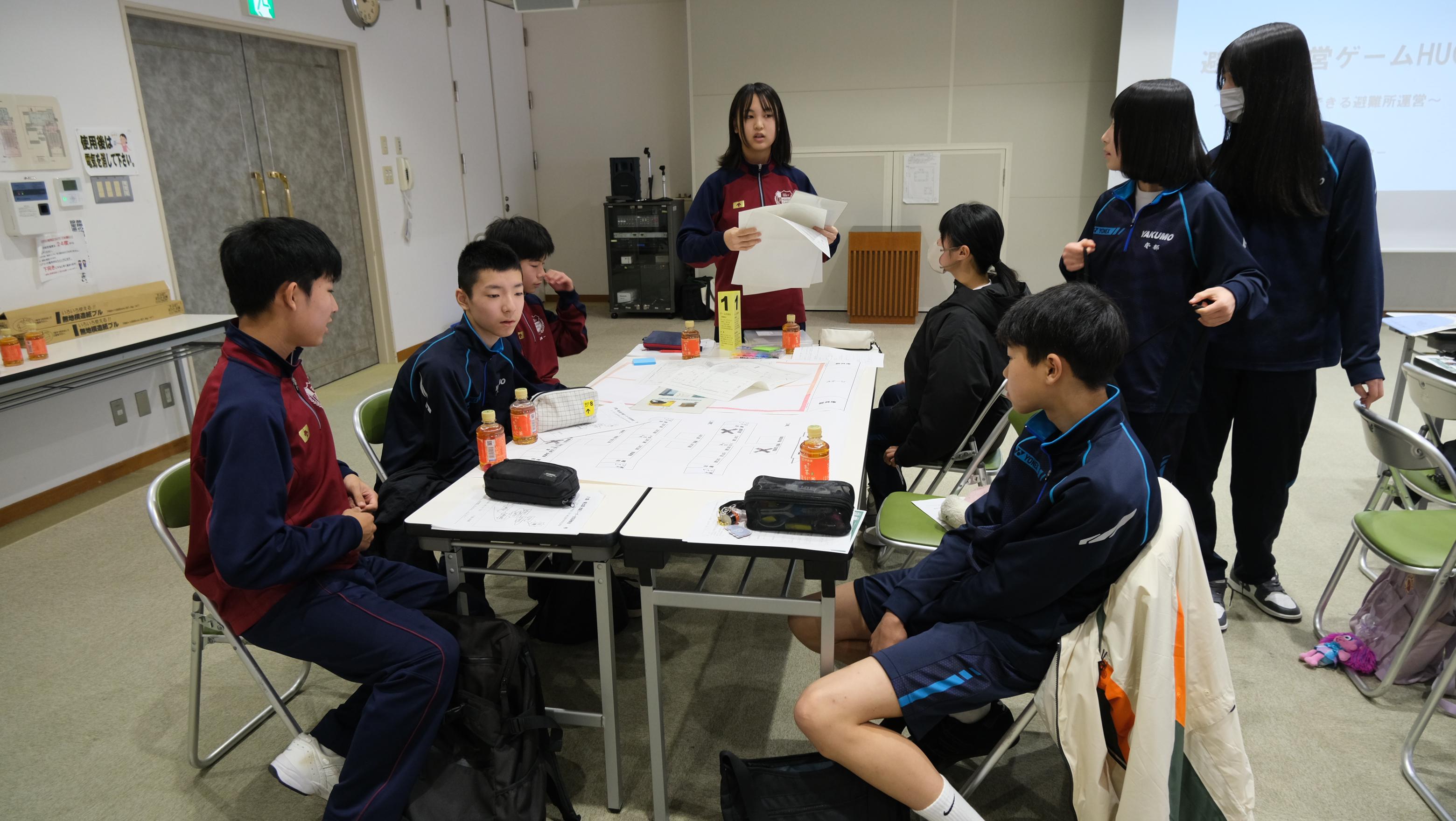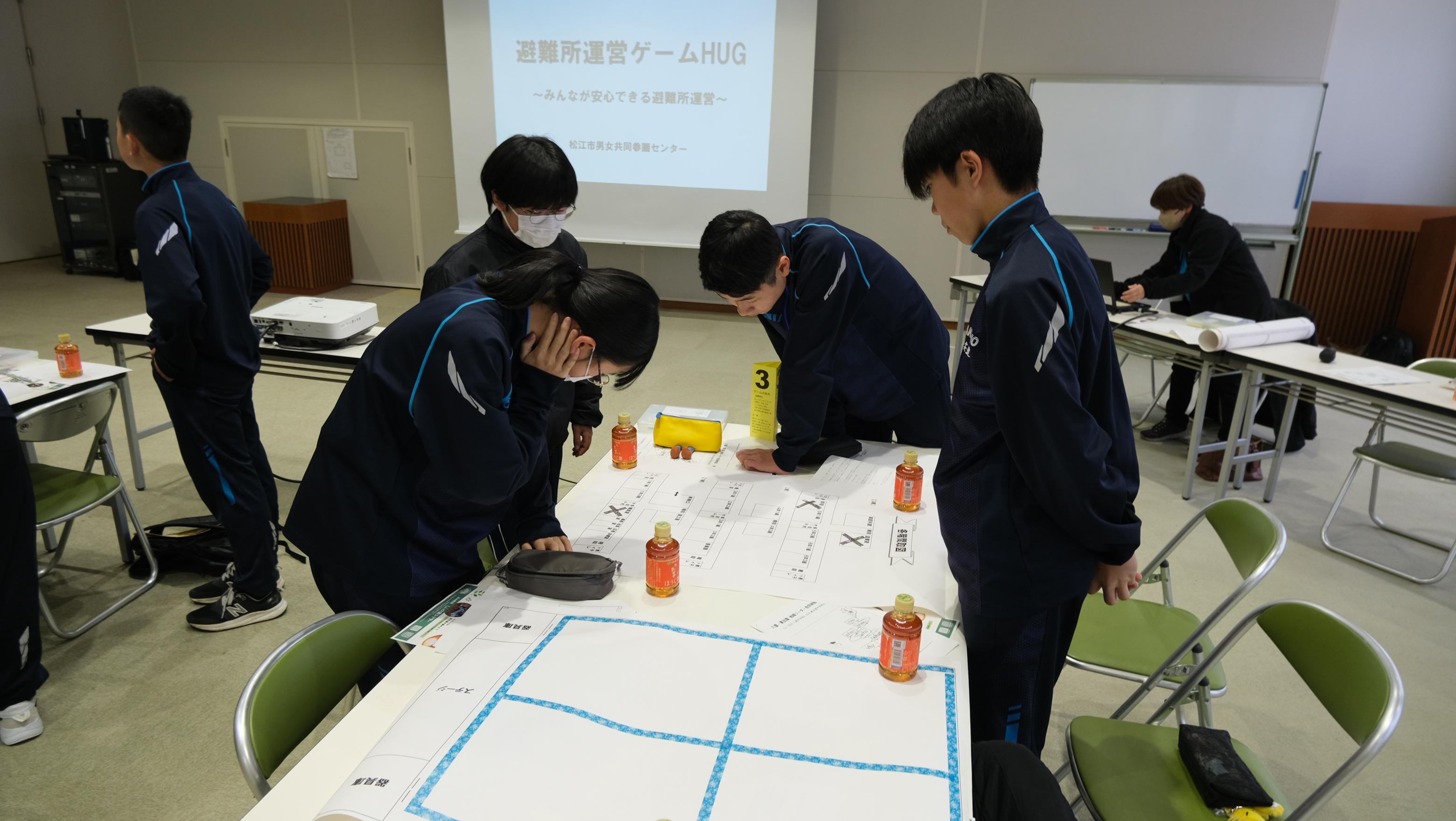 後半は、避難所運営ゲーム「HUG](ハグ)を行いました。松江市男女共同参画センターと市の防災部の方に説明をしていただき、実際に学校が避難所となったときにどのように避難所を運営するのか、シミュレーションしました。生徒たちはコミュニケーションワークショップとHUGを体験して、これからの生徒会活動で活用できそうな内容について考えていました。地域の方も参加していただき、楽しく充実した活動となりました。