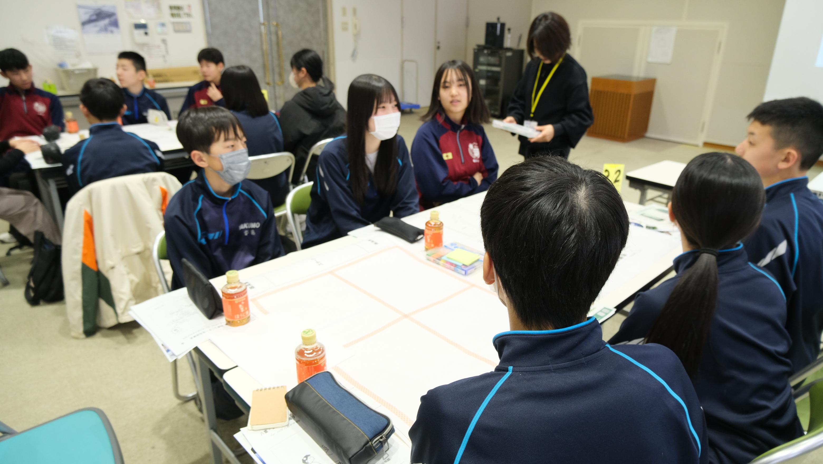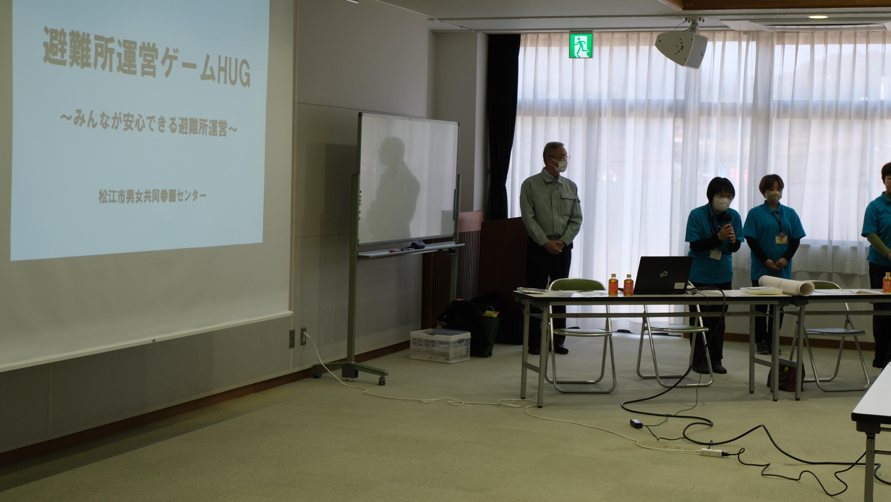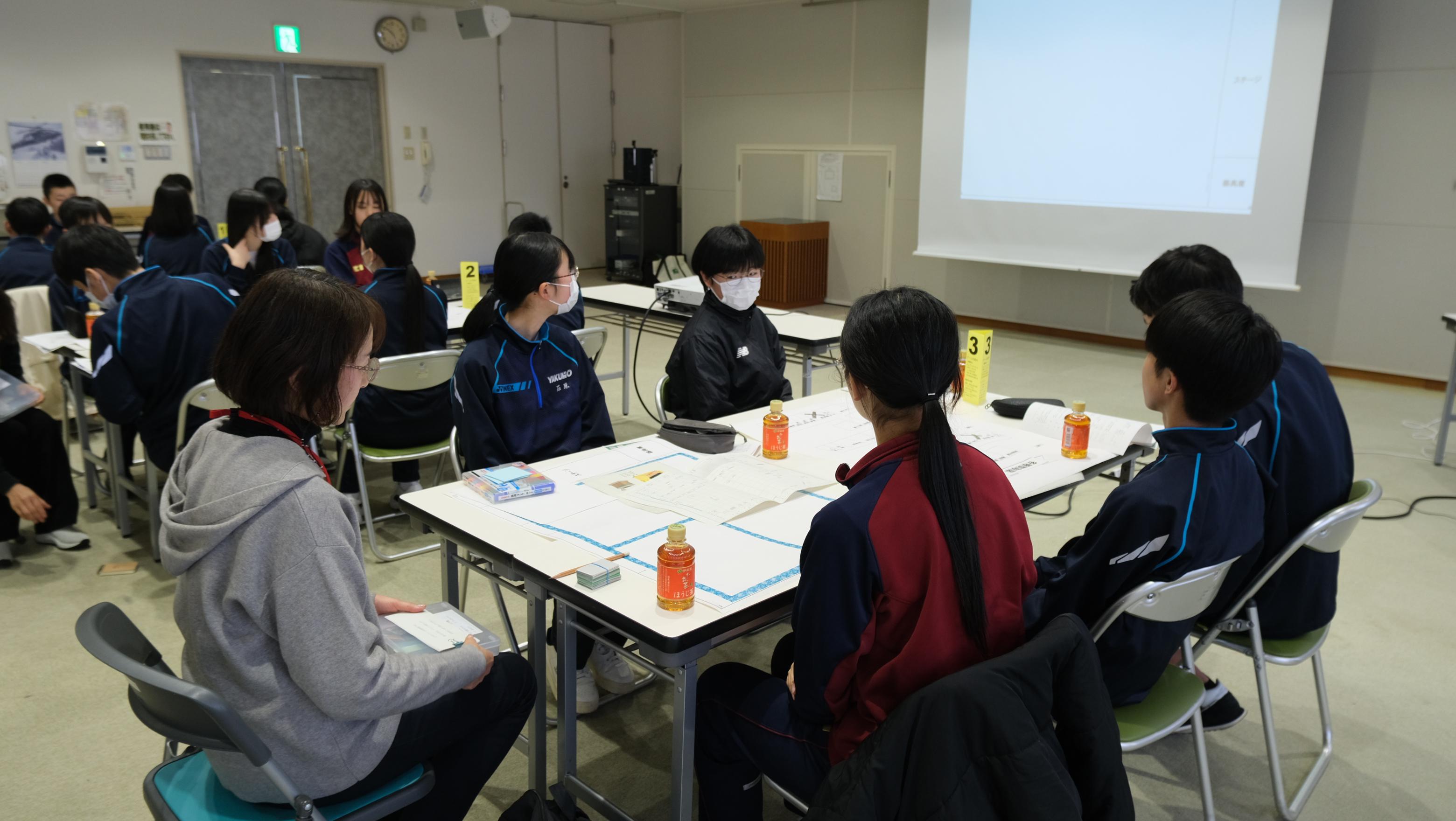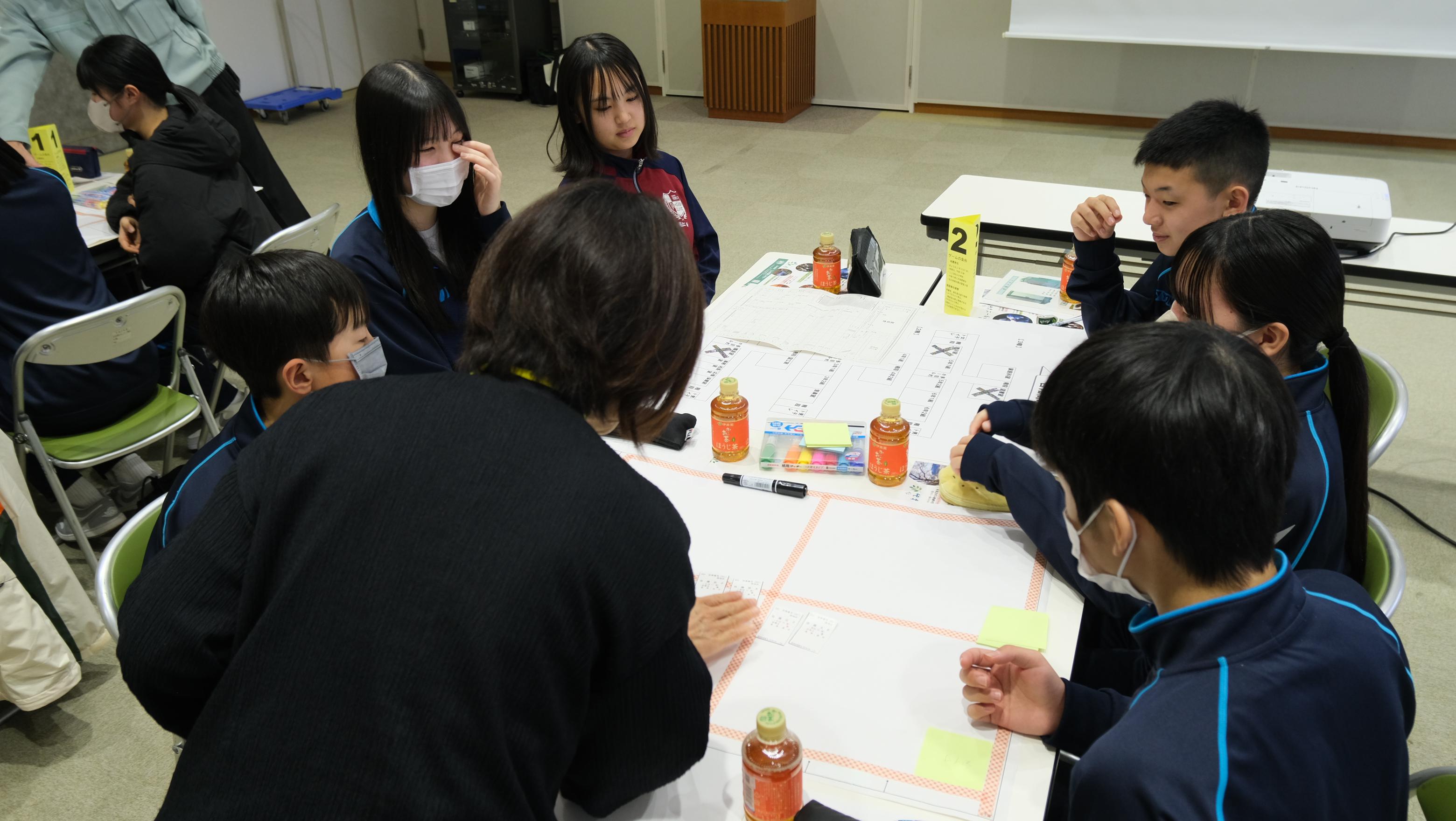 後半は、避難所運営ゲーム「HUG](ハグ)を行いました。松江市男女共同参画センターと市の防災部の方に説明をしていただき、実際に学校が避難所となったときにどのように避難所を運営するのか、シミュレーションしました。生徒たちはコミュニケーションワークショップとHUGを体験して、これからの生徒会活動で活用できそうな内容について考えていました。地域の方も参加していただき、楽しく充実した活動となりました。