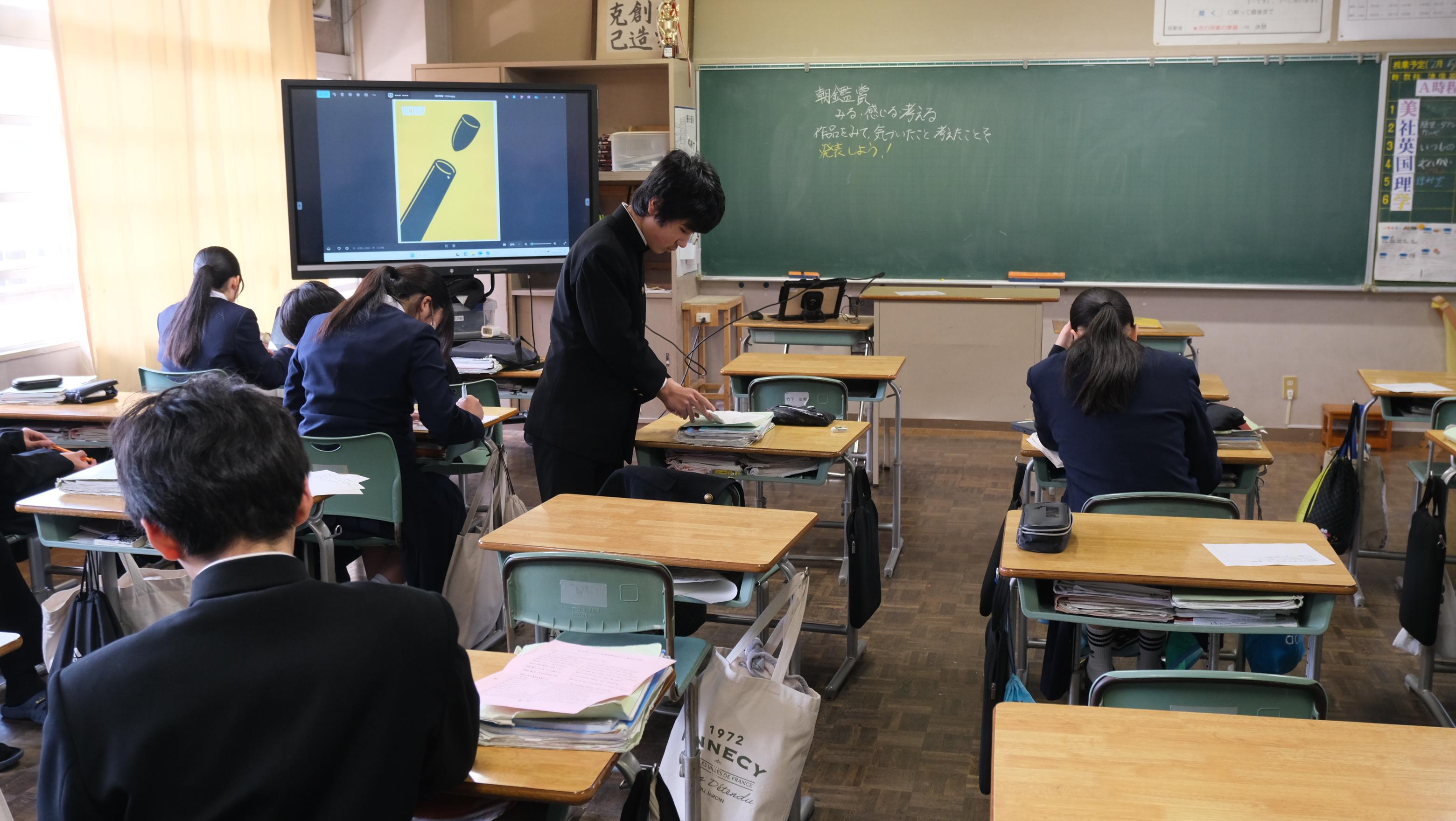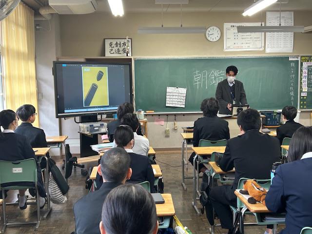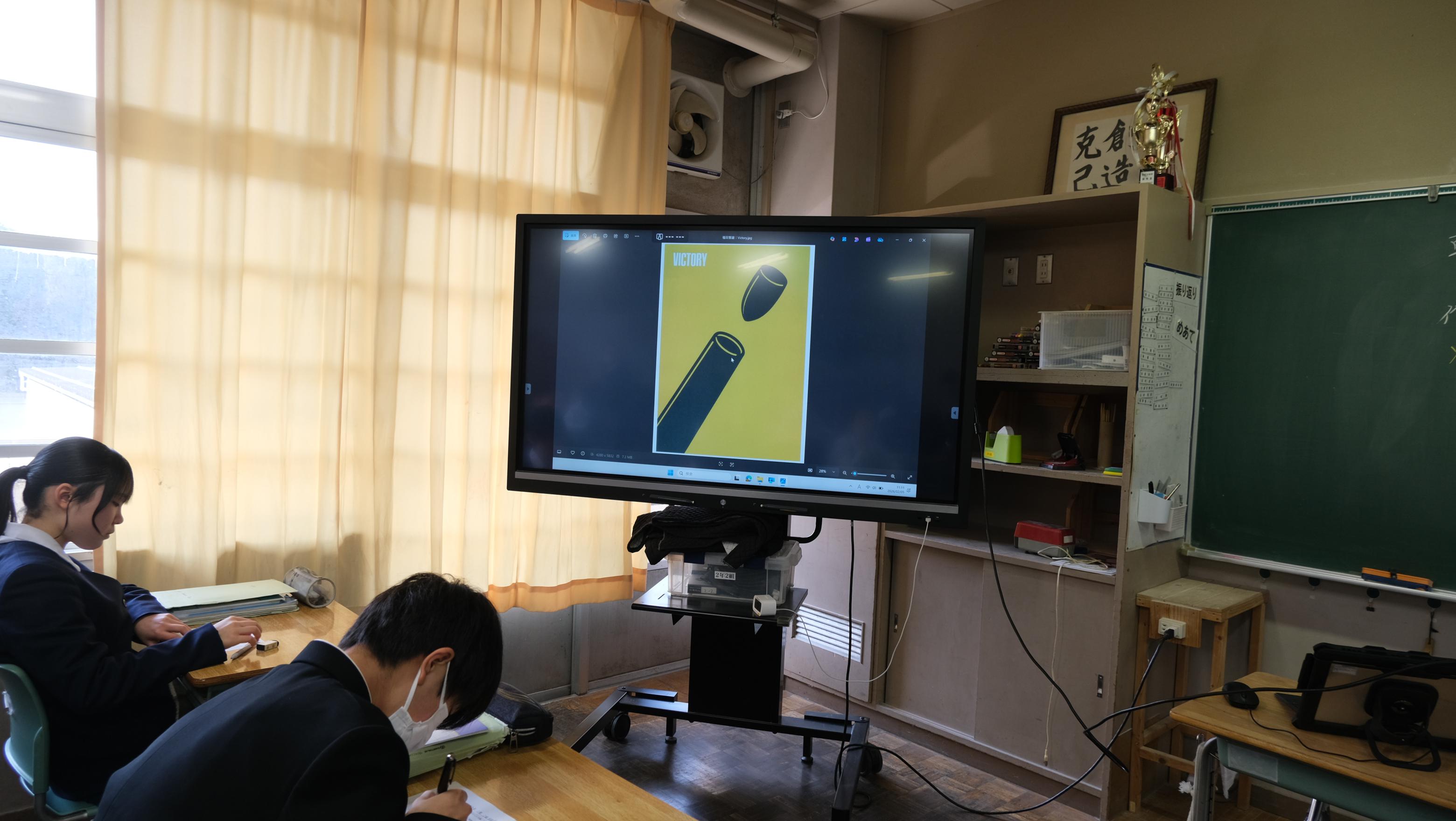 昨日は3年生、今日は2年生で「朝鑑賞」が行われました。「朝鑑賞」は朝礼前の10分間を使って絵画作品をみて、気づいたことや感じたこと、考えたことを話し合う対話鑑賞の取組です。2学期にオリエンテーションをしてから、3学期にやっと実施することができました。短い時間でしたが、「この作品のよさや美しさはなにか?」一人一人が一生懸命考えました。作品は、「福田繫雄」の「VICTORY」を鑑賞しました。この作品は国際ポスターコンクールで発表された作品で、大砲から発射された砲弾が、そのままUターンして帰ってくる様子をシンプルに描写した、戦争の愚かさと平和への願いを表現しているといわれています。作品の解説はしませんでしたが、生徒は「暴力」「戦争」「平和」などをイメージしていました。