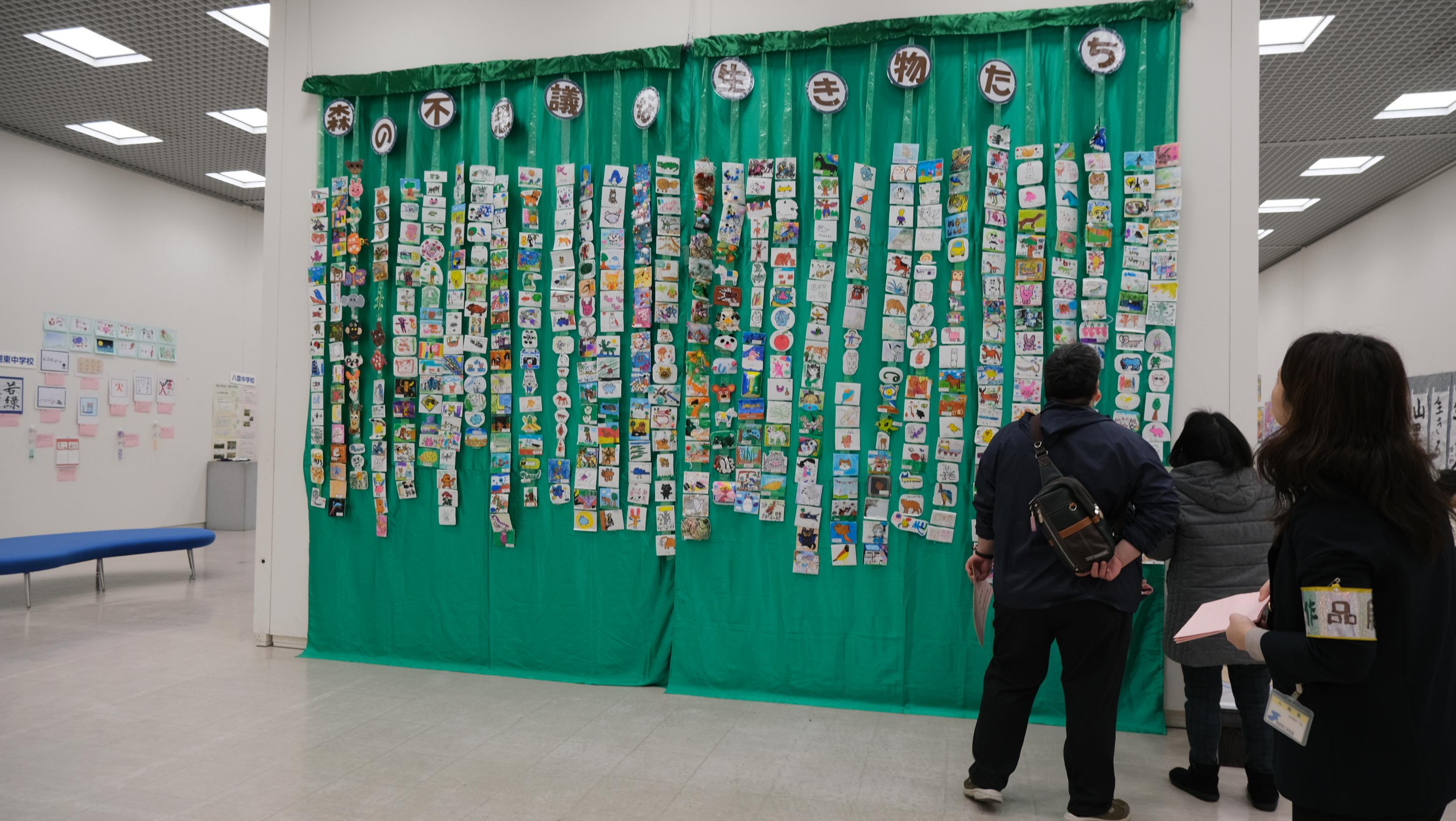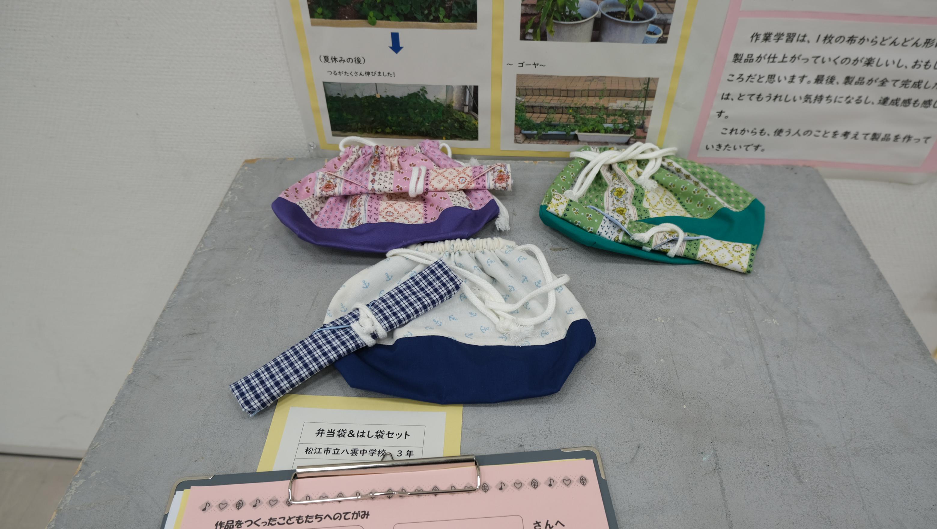 島根県立美術館のギャラリー展示室では、「ゆうあい作品展」が開催されています。この作品展は、松江市の特別支援学級や特別支援幼児教室、特別支援学校で学ぶ子どもたちが日頃の成果を発表する場として開催され、今年で20回目の展覧会です。入り口には発泡トレイを活用した「森の不思議な生き物たち」のモニュメントがあります。八雲中学校からは、ふたば学級3年生の作品が出品されています。作業学習の様子や、書き初めが展示されています。そして、丁寧に縫われたお弁当袋と箸袋の作品があり、春からの進学先で早速使える素晴らしい出来でした。また、会場には各学校用のポストが設置されており、作者へお手紙を書くことができます。たくさんの人が、じっくりと作品を鑑賞し手紙を書いてポストに投函していました。