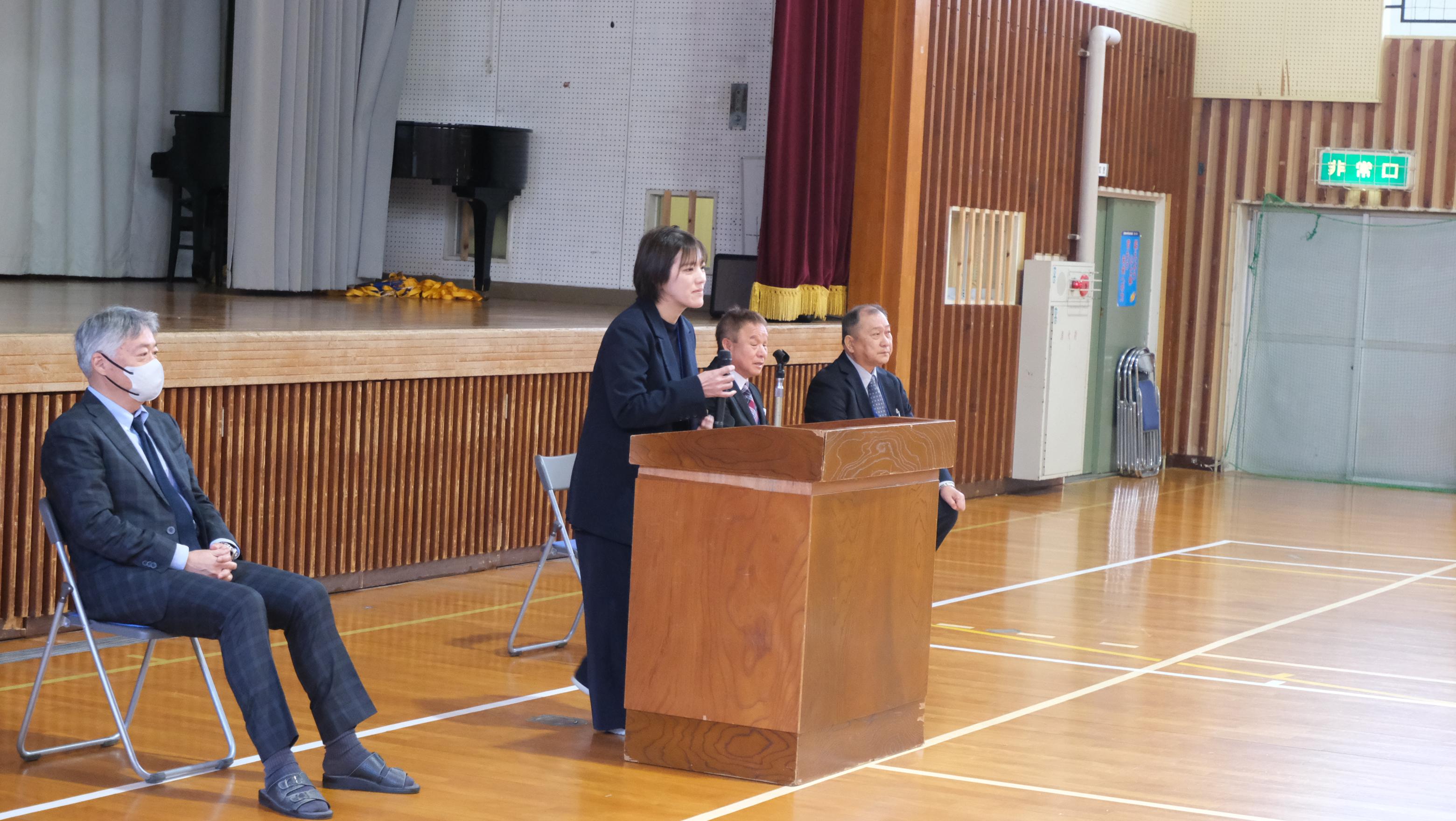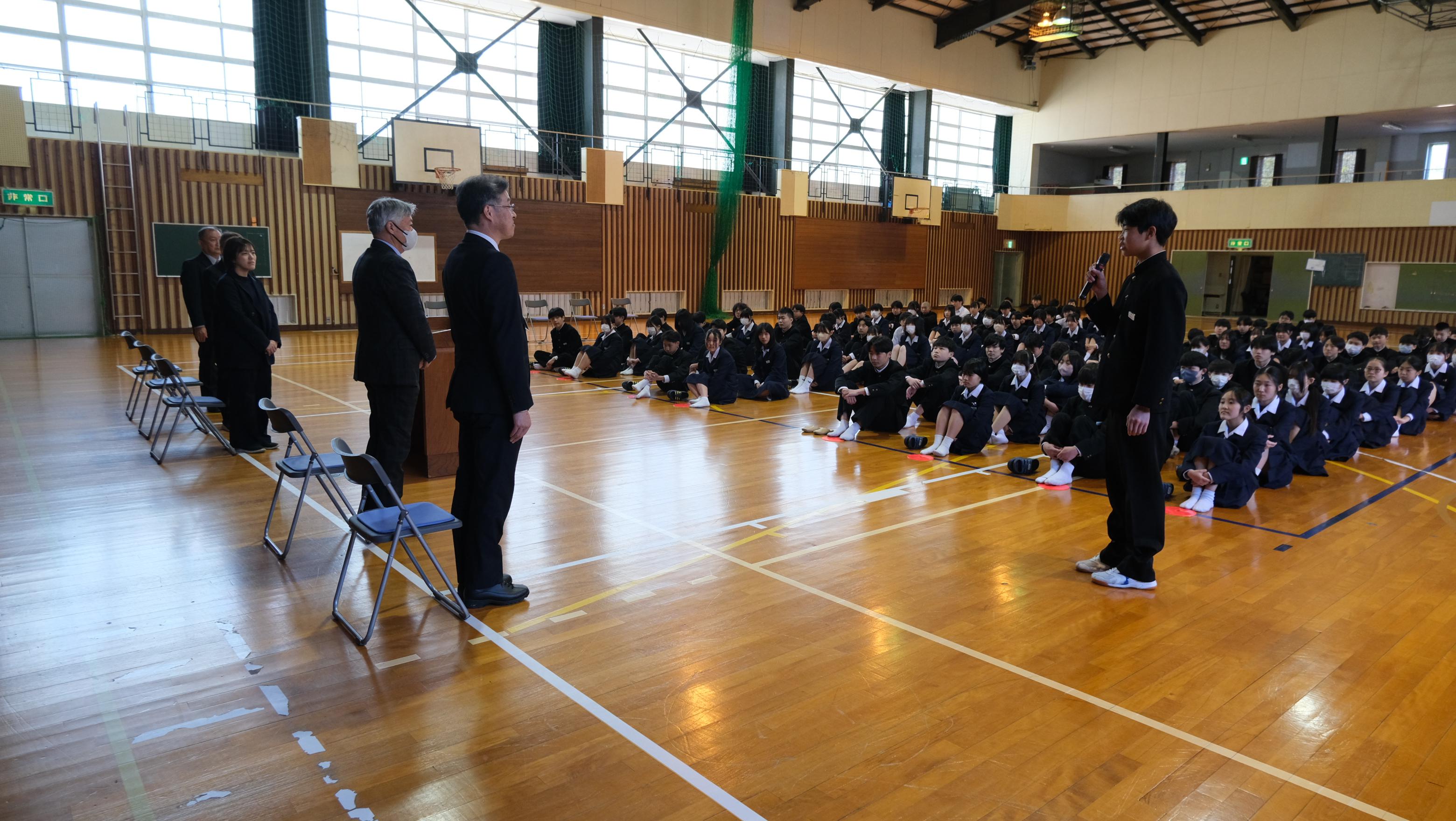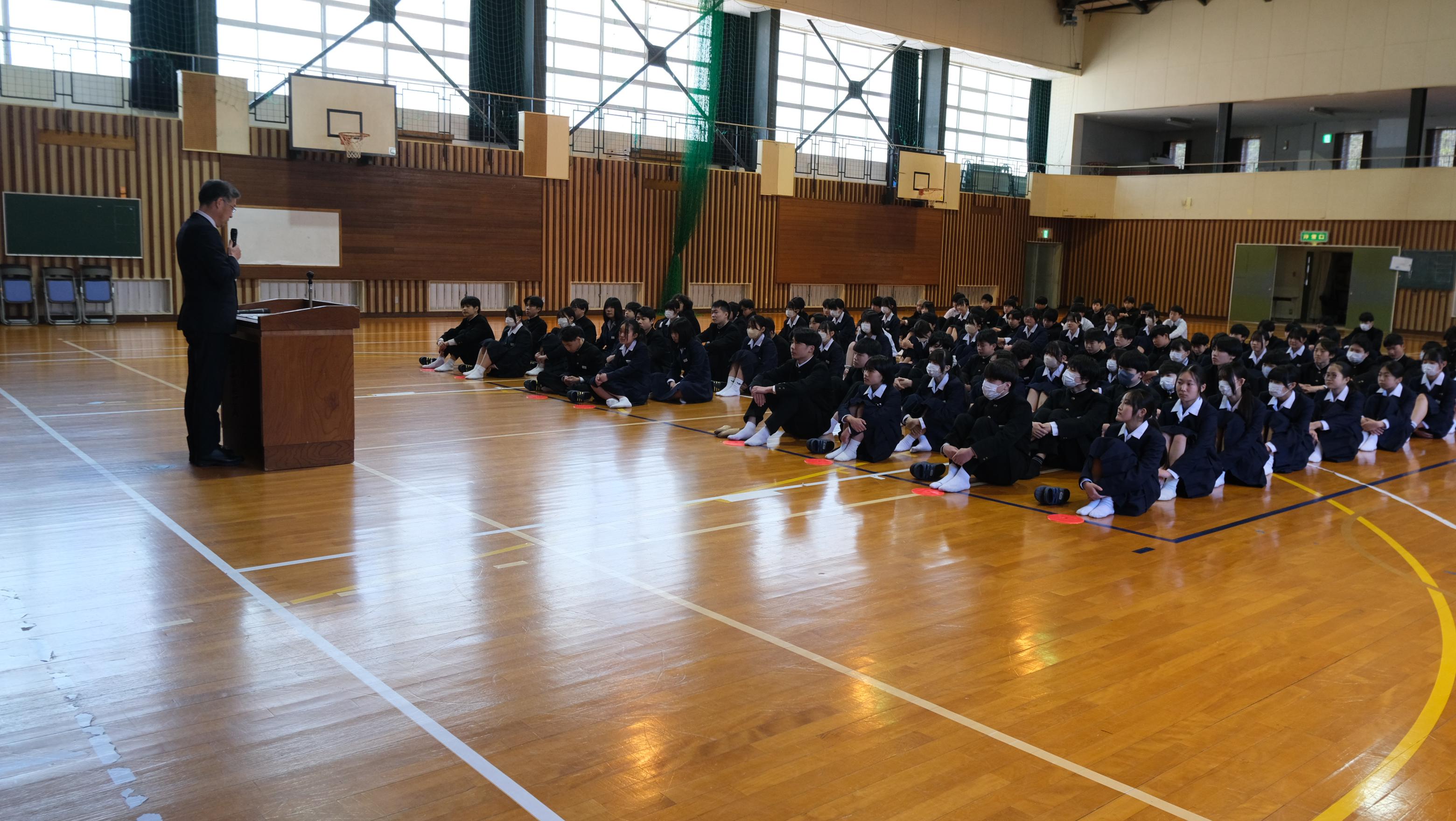 9時過ぎ、進級した2年生、3年生が体育館に集まり、着任式、始業式を行いました。