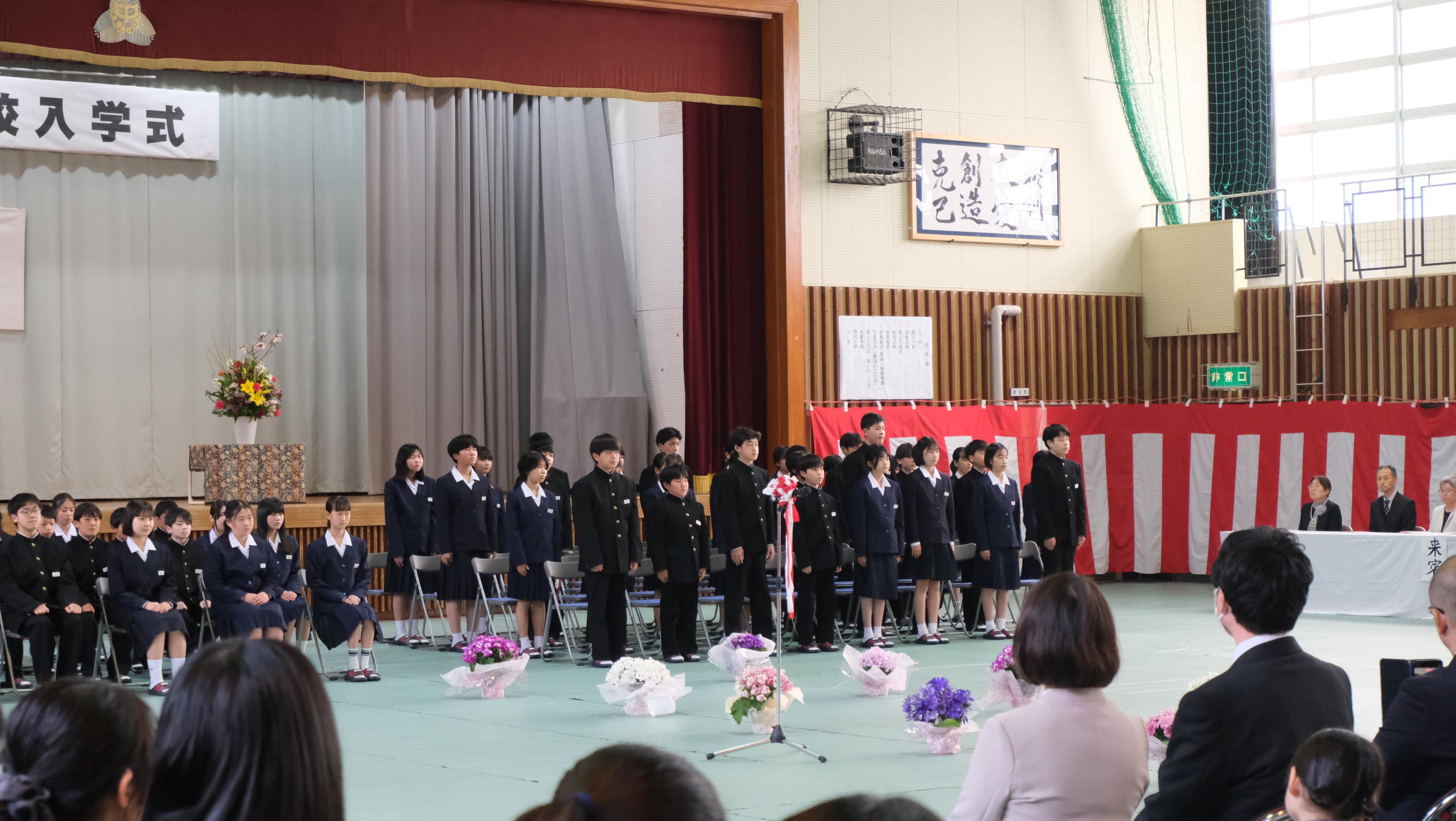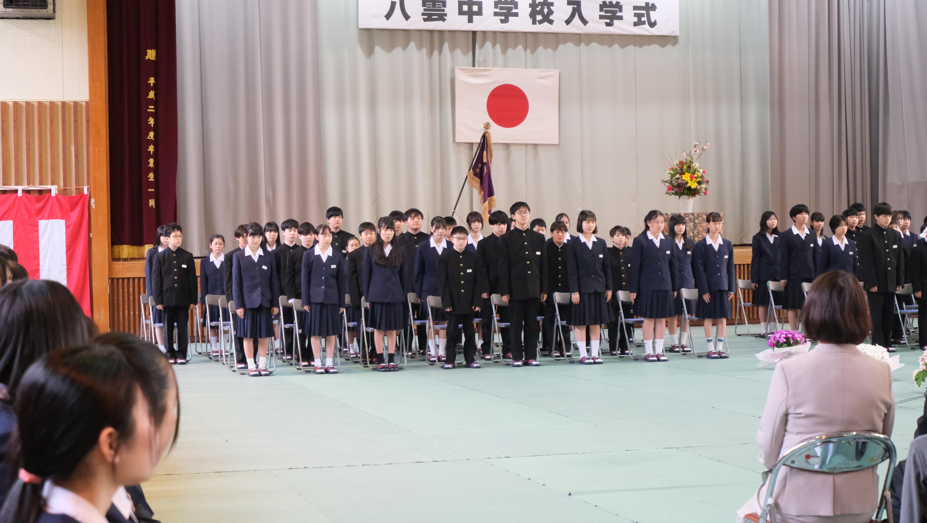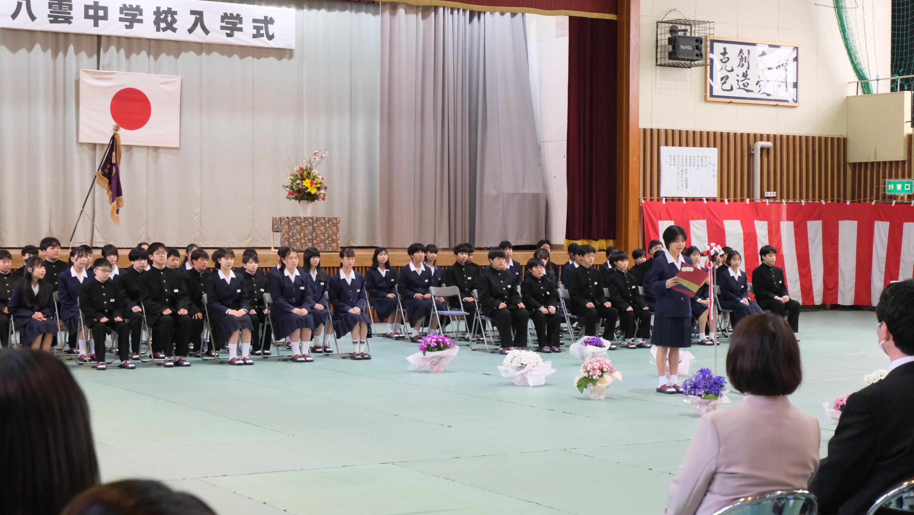 校長式辞では、「これから始まる三年間の中学校生活、その中で、仲間と共に協力し、挑戦する意欲、強い意志をもった八雲中生へと成長していきましょう」と伝えました。そして、来賓祝辞、生徒代表による「歓迎のことば」を受け、新入生代表による「誓いのことば」では、「今日から三年間、一日一日を大切にし、何事にも一生懸命取り組み、支えてくださる方々への感謝の気持ちを忘れず、夢をもって、それを叶えるために、日々努力していきたい」と力強く言葉を述べてくれました。