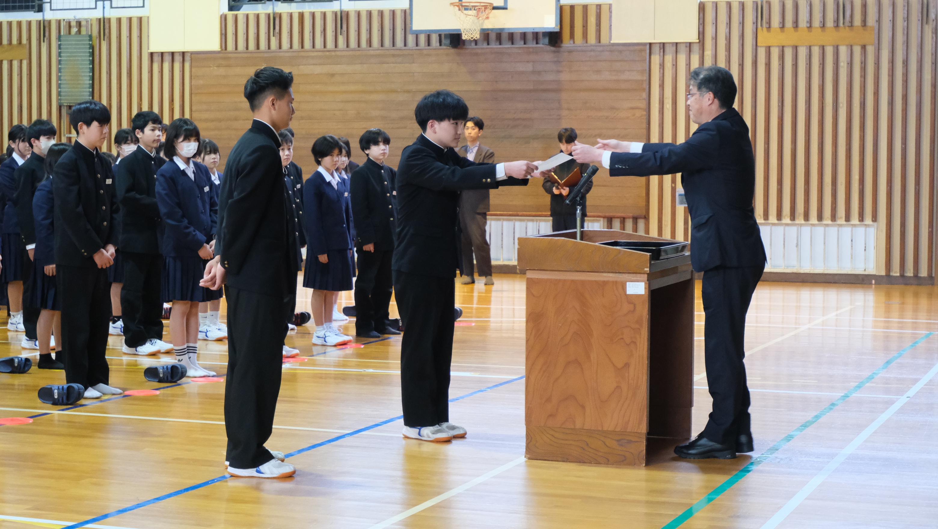 4月17日、「1学期・役生任命式」を行いました。各学級から選出された学級委員、生徒委員の皆さんに任命書を渡しました。委員となった皆さんには、リーダーとなって学校生活の様々な場面において活躍してくることを期待しています。よろしくお願いします!