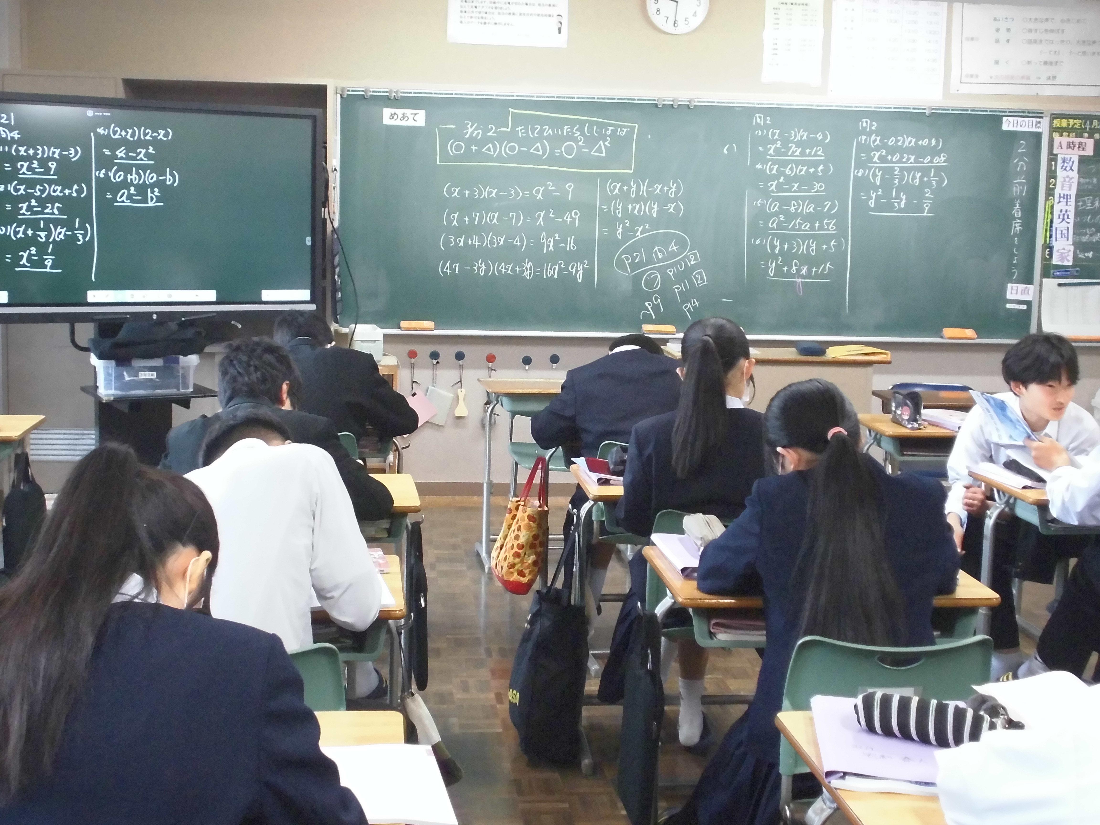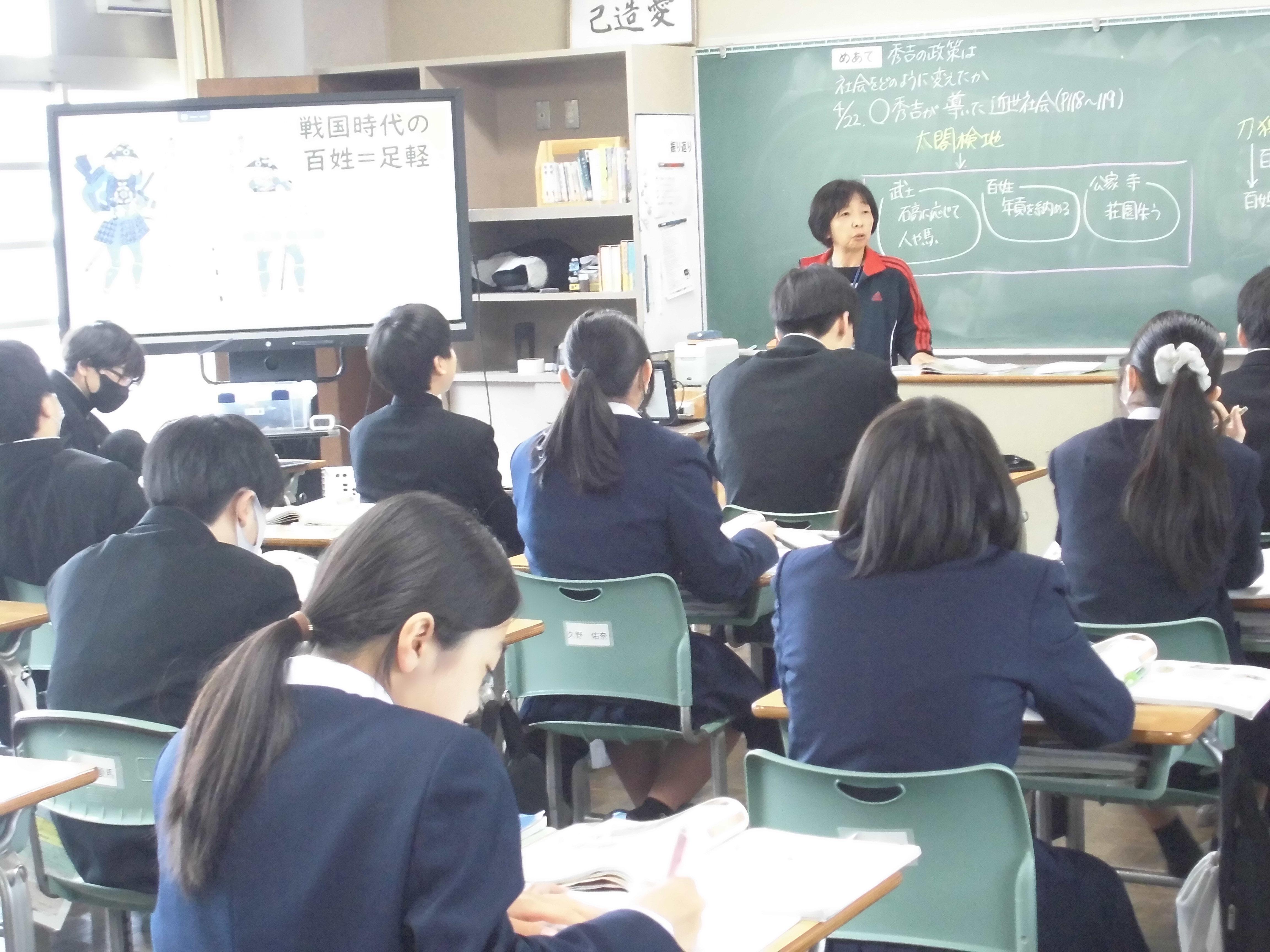 4月22日、今朝は気温が10℃前後と少し肌寒い1日のスタートとなりました。1~2校時にかけて教室や体育館をまわってみると、3年生は家庭科(幼児の発達について)や数学(式の展開の計算練習)、2年生は体育(体力テスト・シャトルラン)や社会(刀狩りについて)の学習中。こうした毎日の1つ1つの授業に集中することで、自分の力をしっかり伸ばしていこう!